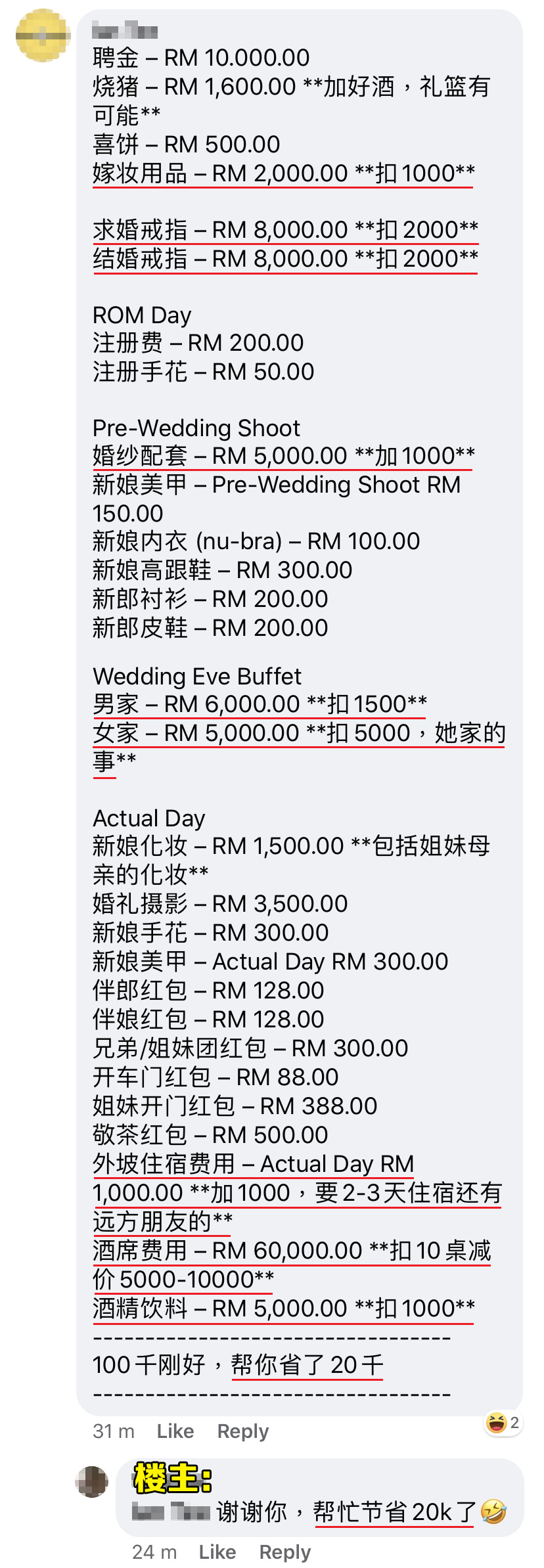 ▼ 算一算,还省下了RM20,000!楼主还留言感谢了呢!