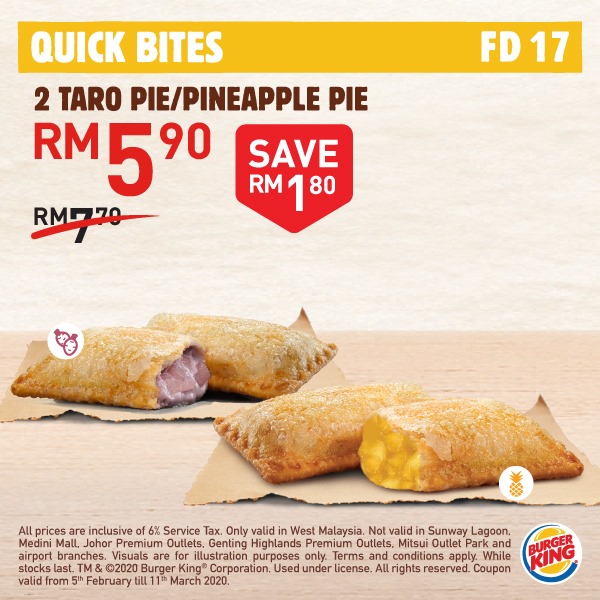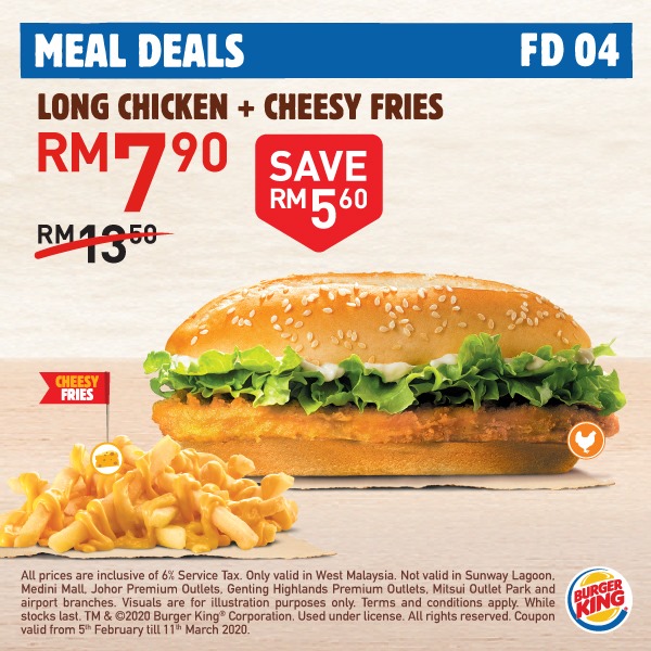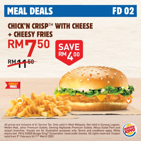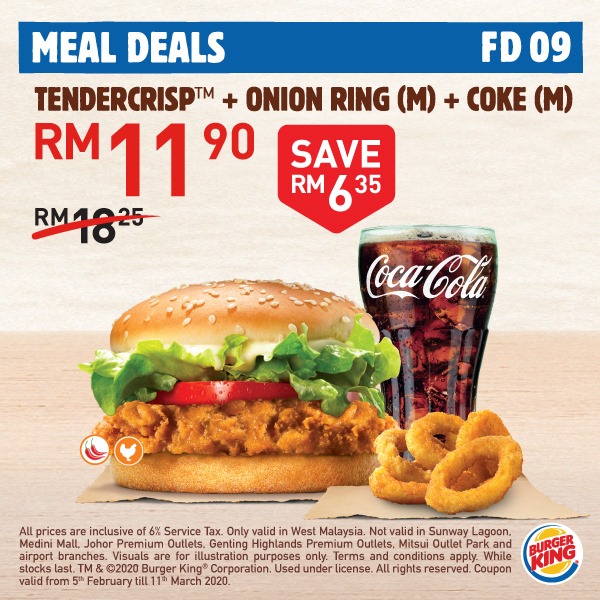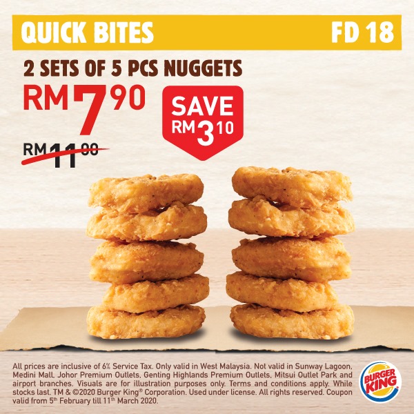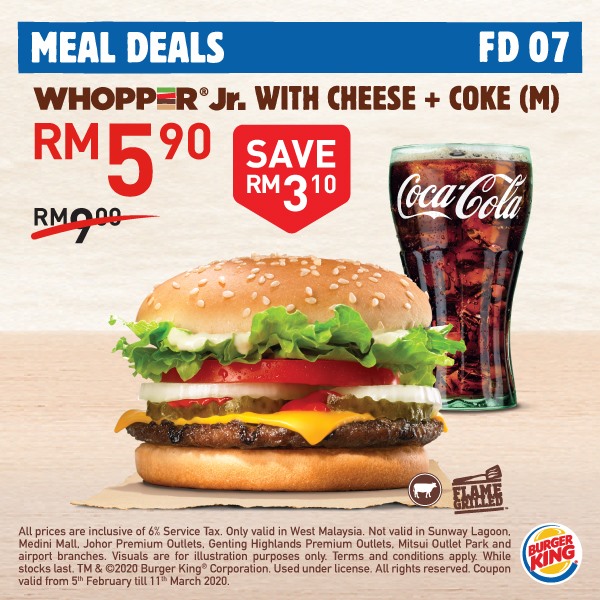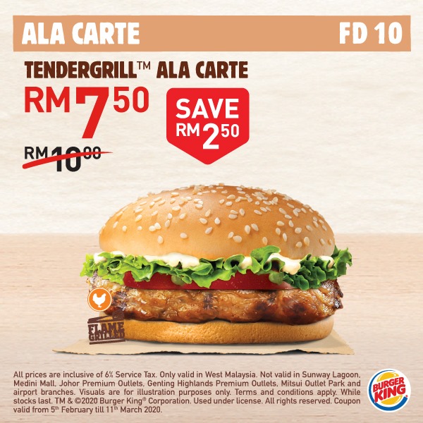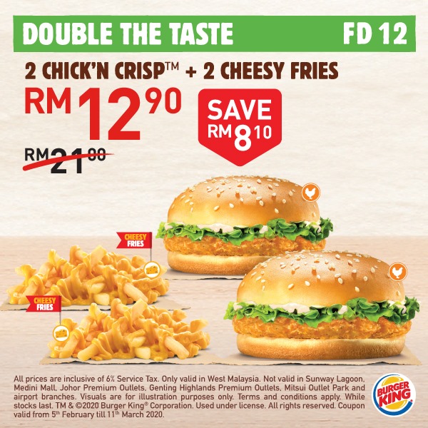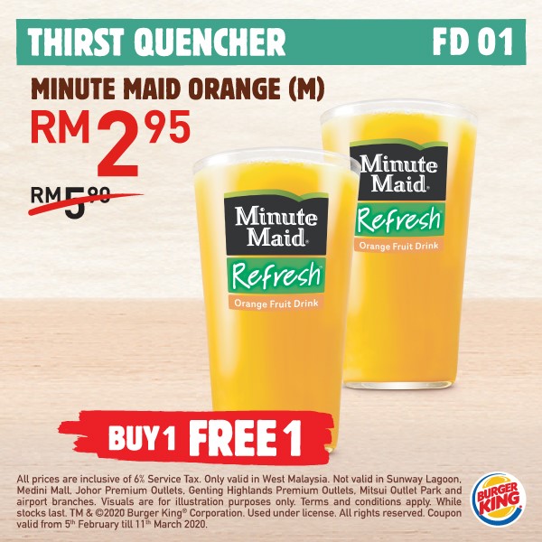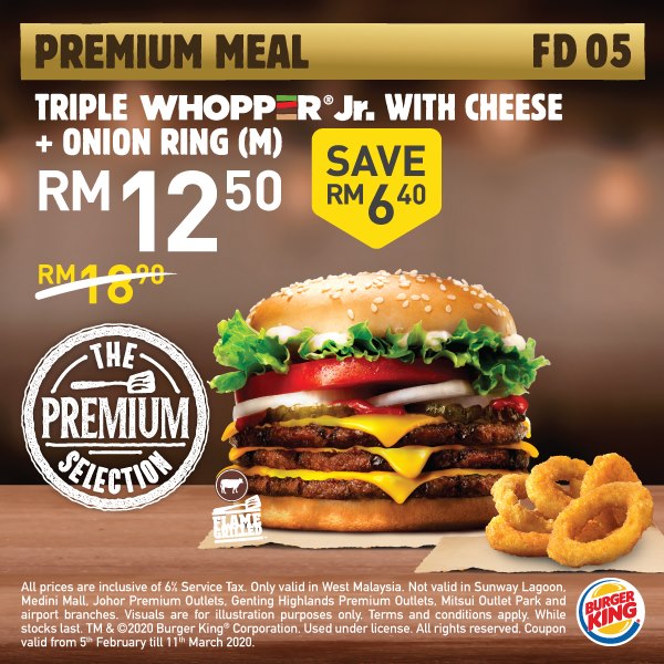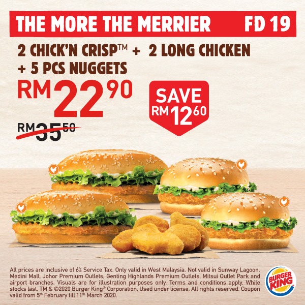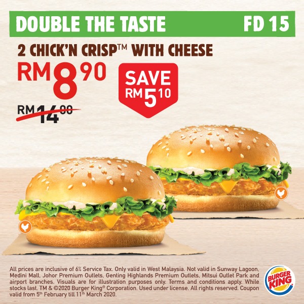 促销地点:西马Burger King分行(除了Medini Mall、Sunway Lagoon、Genting Highlands Premium Outlet、Johor Premium Outlet、Mitsui Outlet Park 和Airport分行)