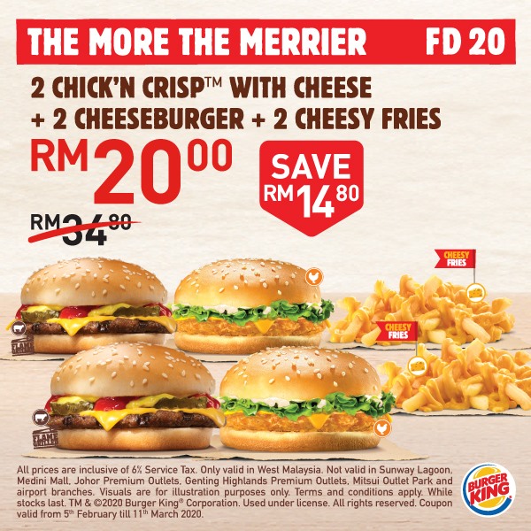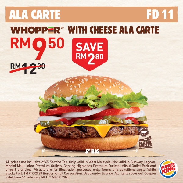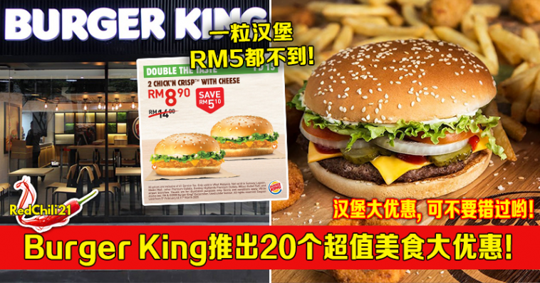 从即日起至3月11日你可在大马Burger King 分行享有20个美食优惠哦!RM5都不到的汉堡,你怎能错过呢?!