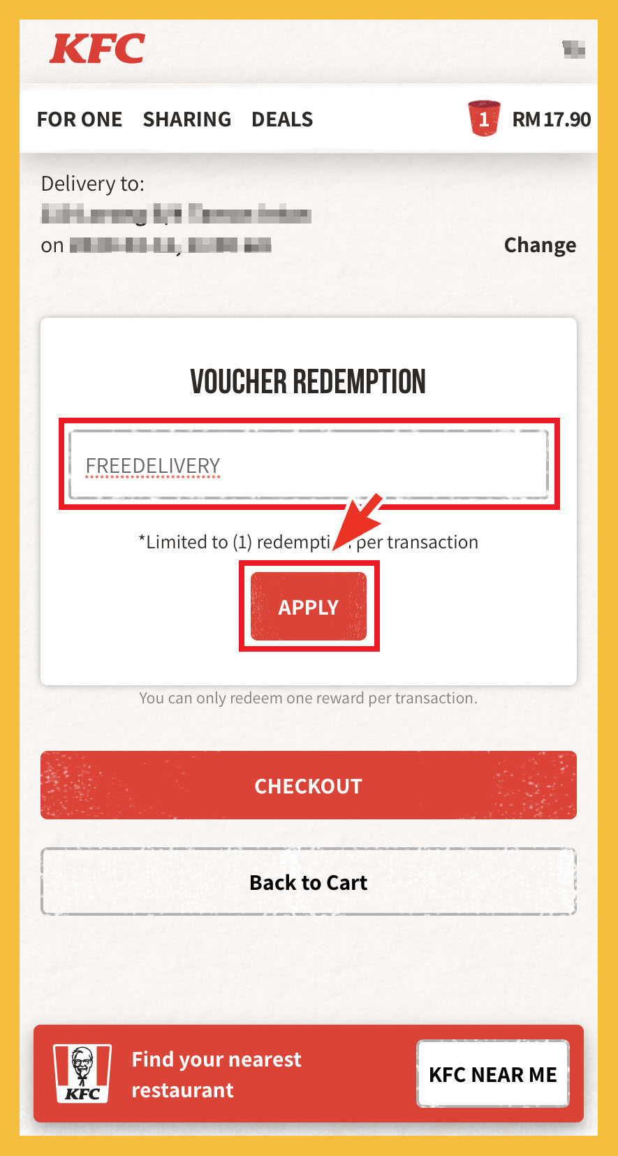 ▼ Step 6:在 “Voucher Redemption” 输入 “FREEDELIVERY”,点击 “Apply”。