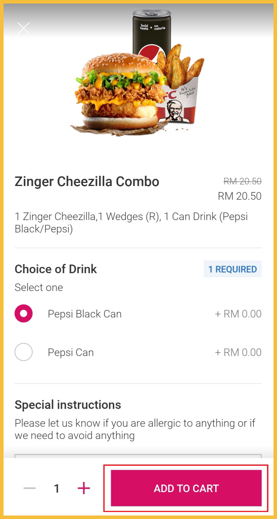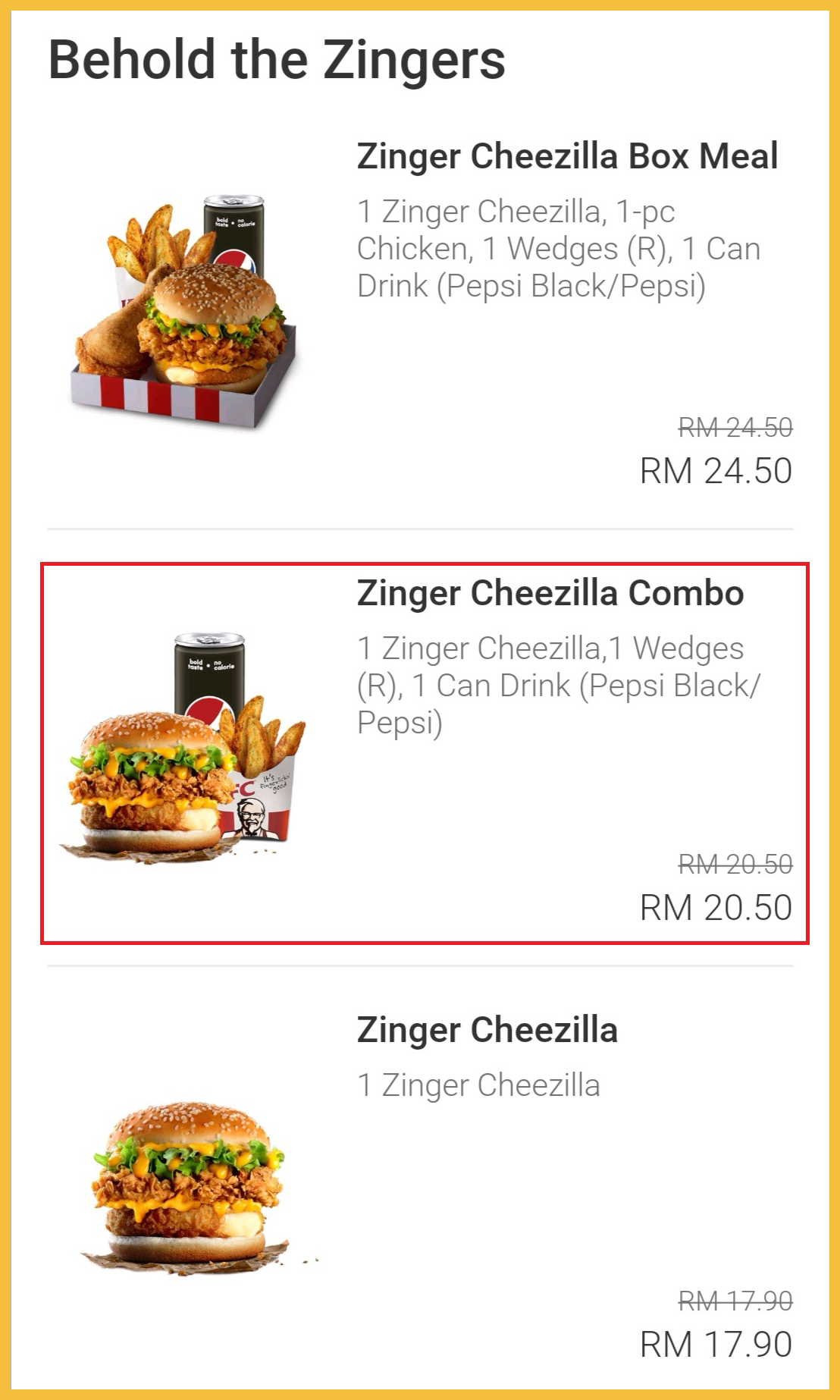 步骤2: 选择想吃的食物或套餐,例如:Zinger Cheezilla Combo