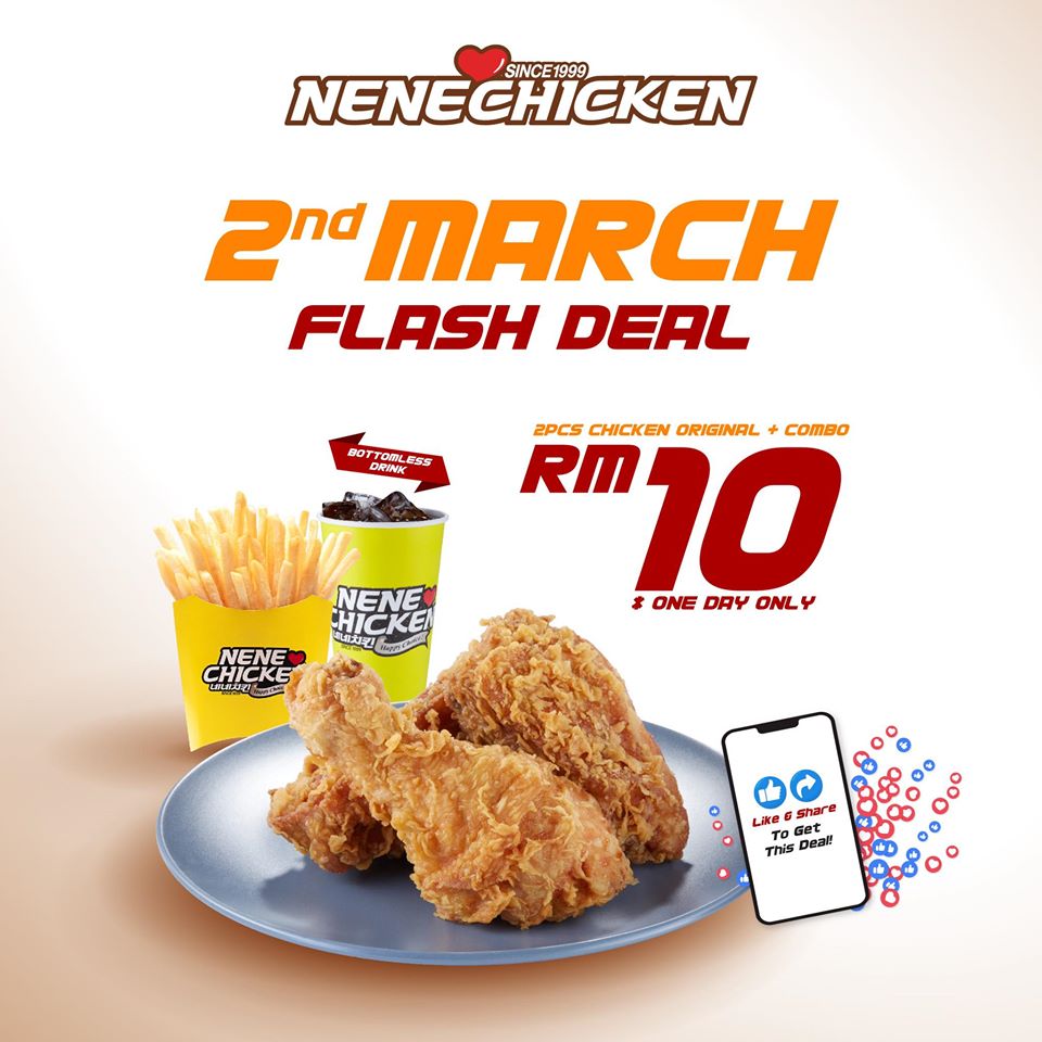 没错!著名炸鸡连锁店 Nene Chicken 推出酥脆韩式炸鸡套餐只需RM10!此套餐包含2支韩式炸鸡+ 一份薯条 + 一杯饮料!