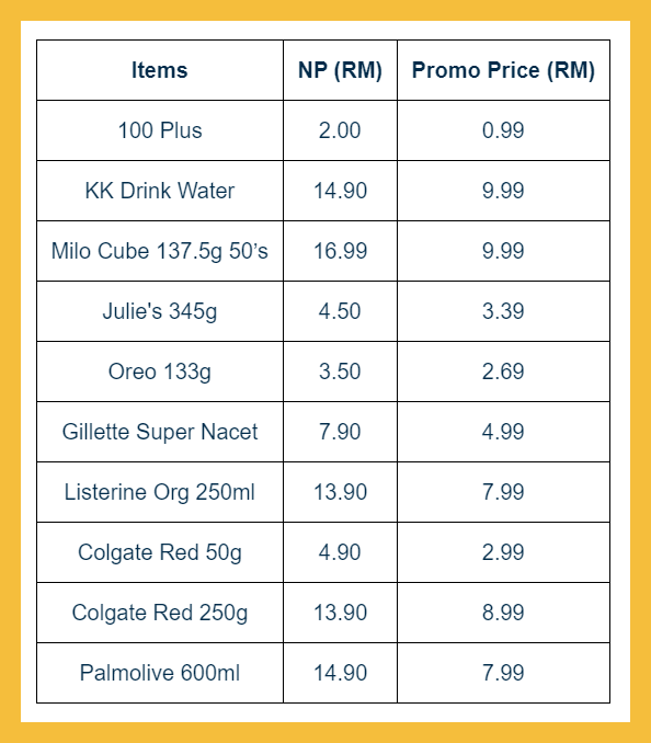 - 1 – 29 Feb: RM1商品—— Kelloggs Cereal Bar Berries Yogurts Coating (25g), Kelloggs Cereal Bar Nutty Choc (30g),Mini Chipsmore Oats Double Choc (80g),Mini Chipsmore Oats Original (80g)