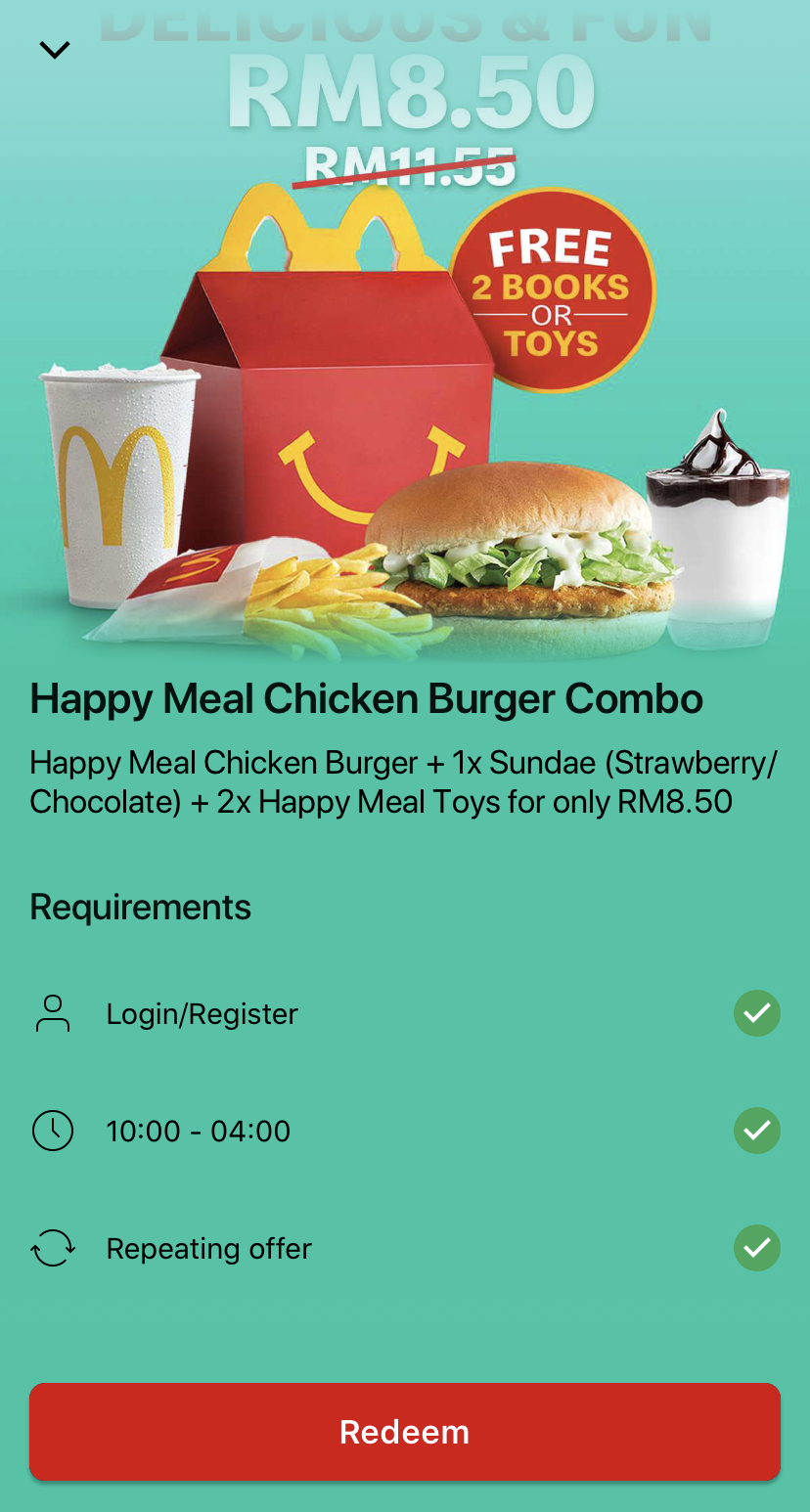 ▼ Happy Meal Chicken Burger Combo 只需RM8.50(原价RM11.55)