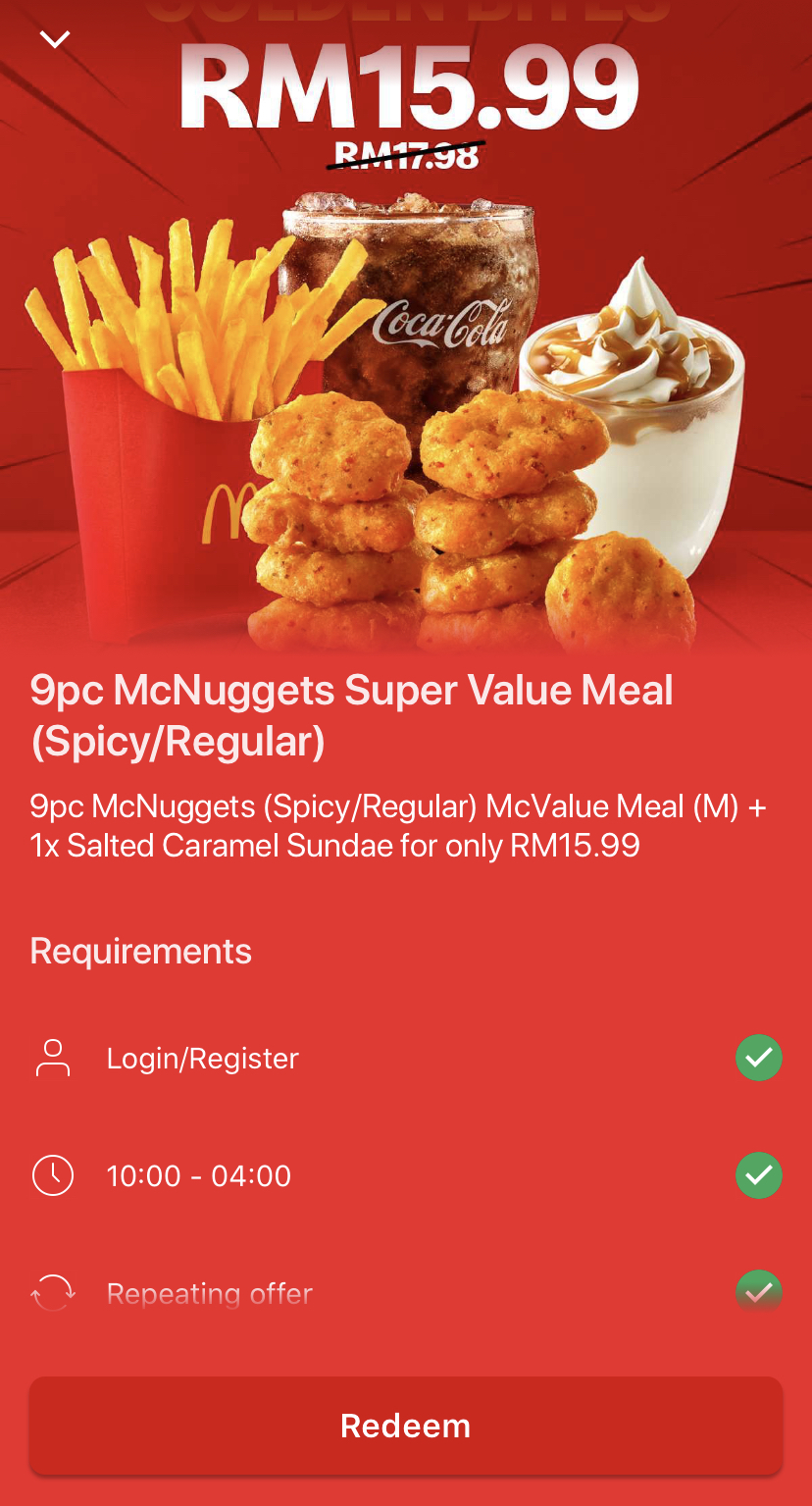 促销条件:购买前须向柜台服务员展示麦当劳电子优惠券即可