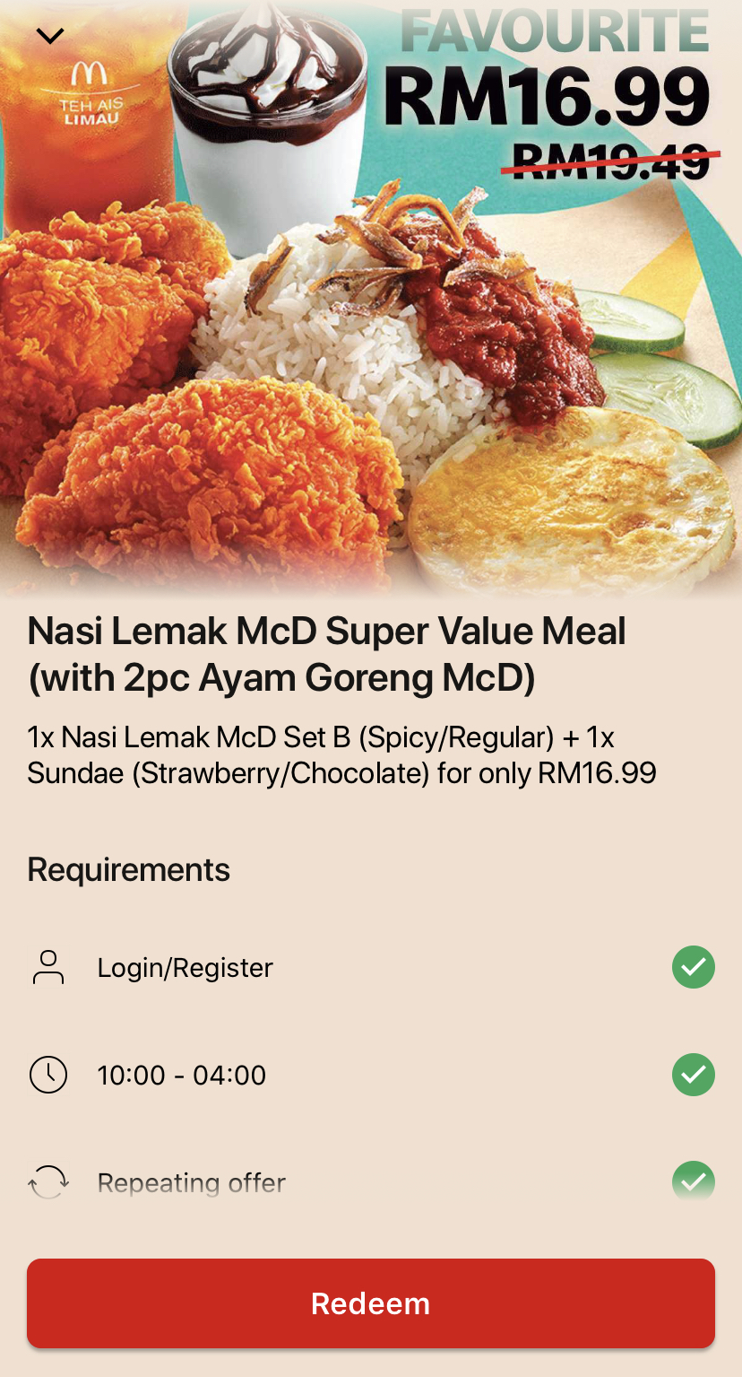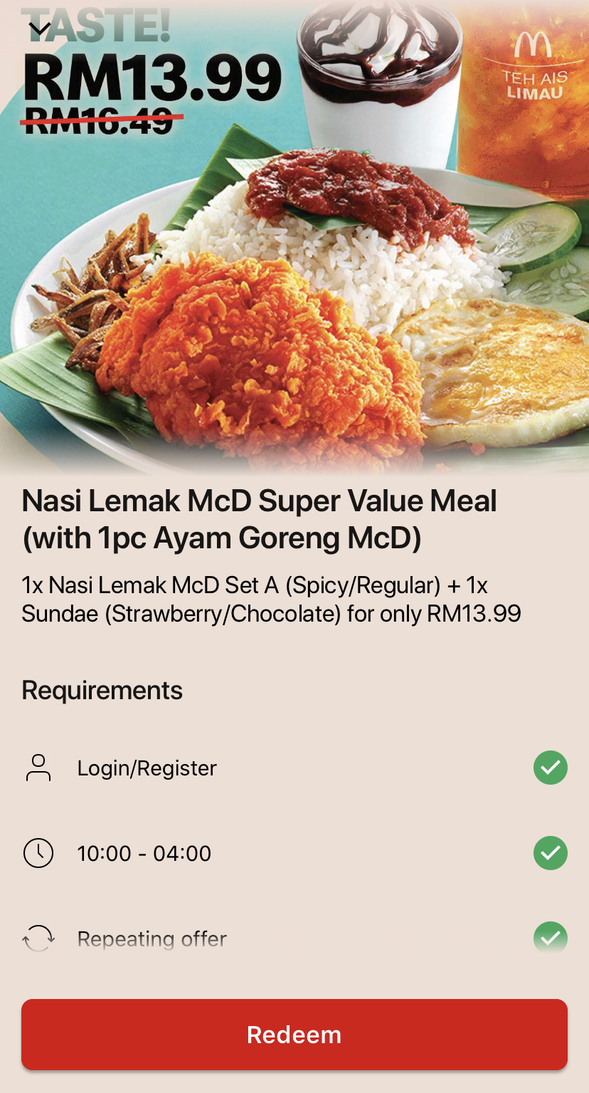 ▼ Nasi Lemak McD Super Value Meal 只需RM13.99(原价RM16.49)