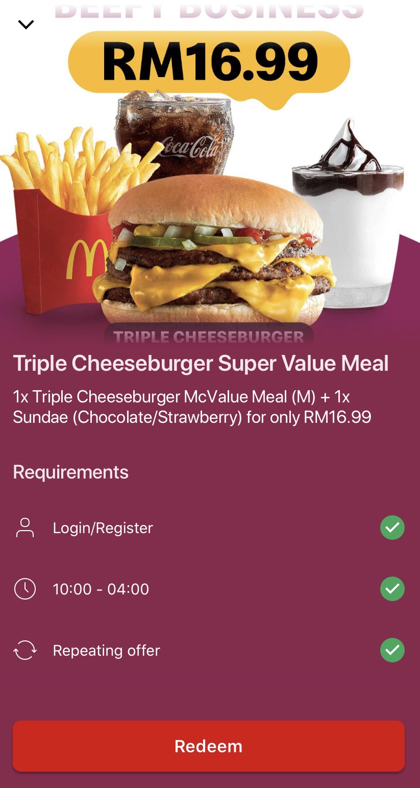 ▼ Triple CheeseBurger Super Value Meal 只需RM16.99