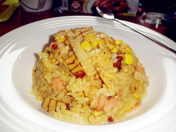 食材:火腿,白菜,豆干,玉米粒,米,咖喱块