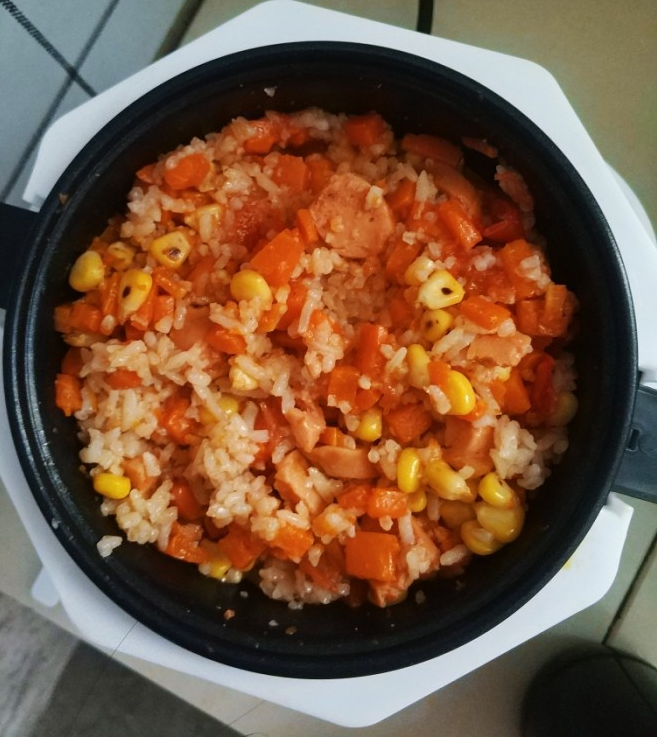食材:米(一杯),盐(2克),番茄(一个),玉米(一根),胡萝卜(一根),生抽(2勺),火腿(2根),老抽(半勺)