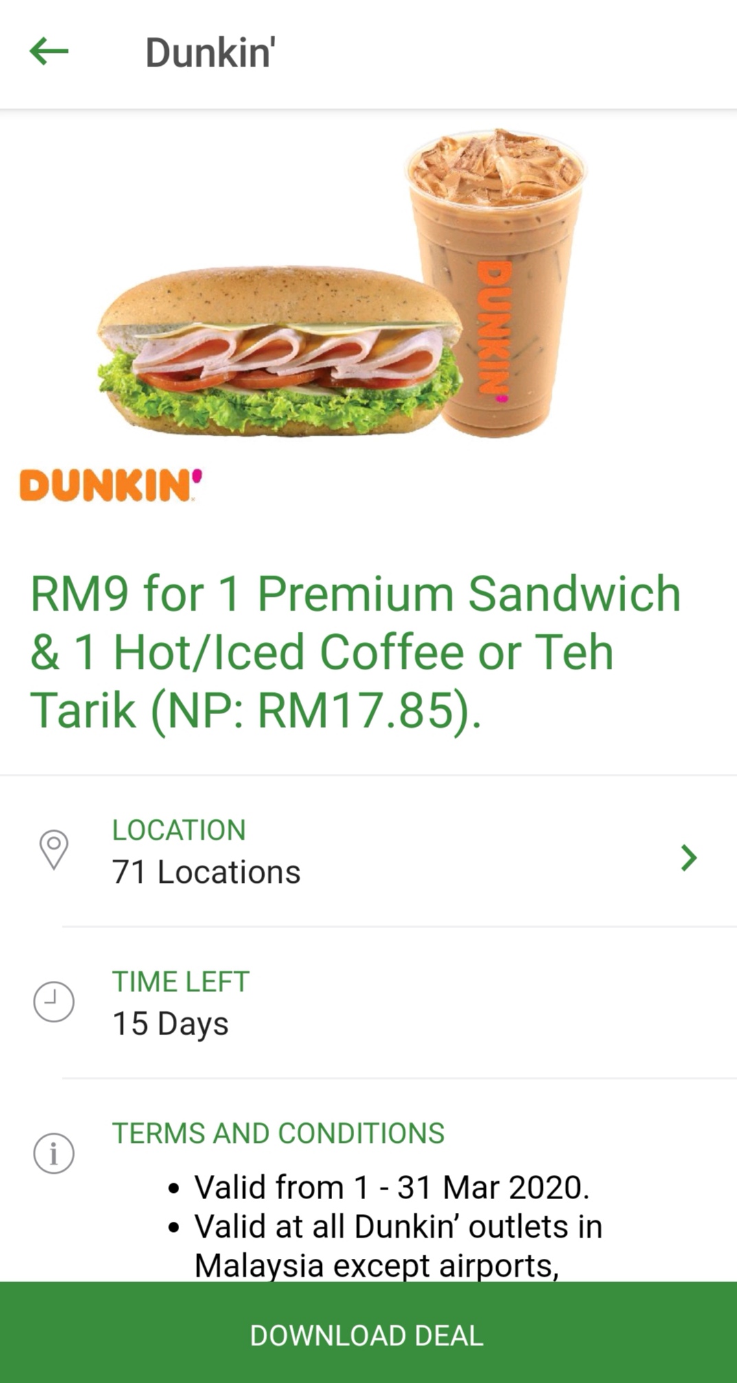 促销活动:Dunkin’ —— 一份Premium Sandwich 和一杯饮料只需RM9