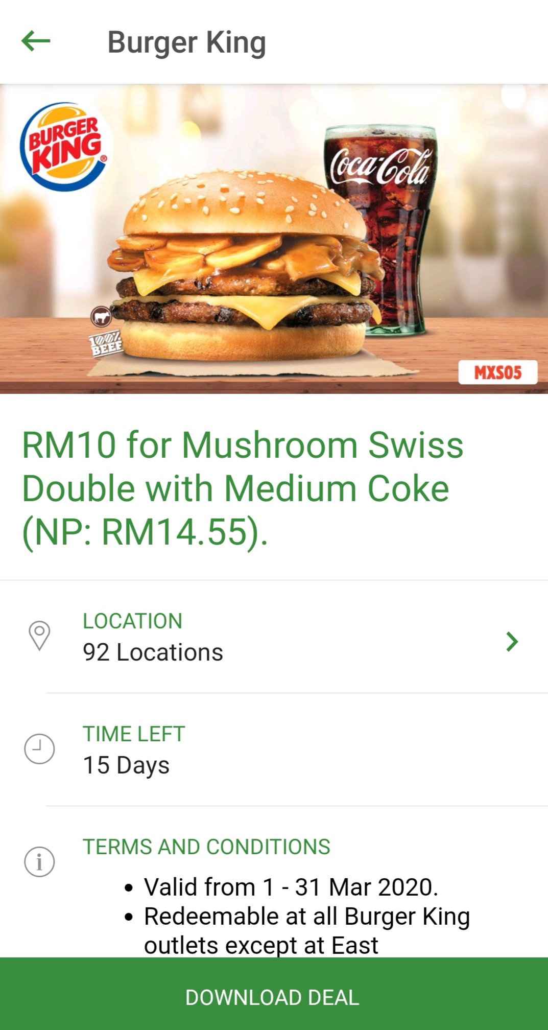 促销活动:Burger King —— 一份Mushroom Swiss Double汉堡盒一杯Coke饮料只需RM10
