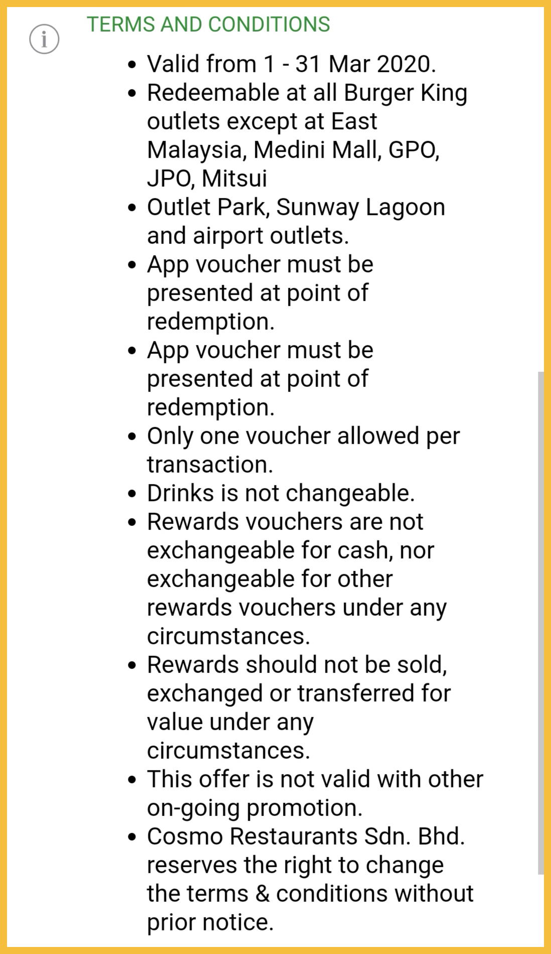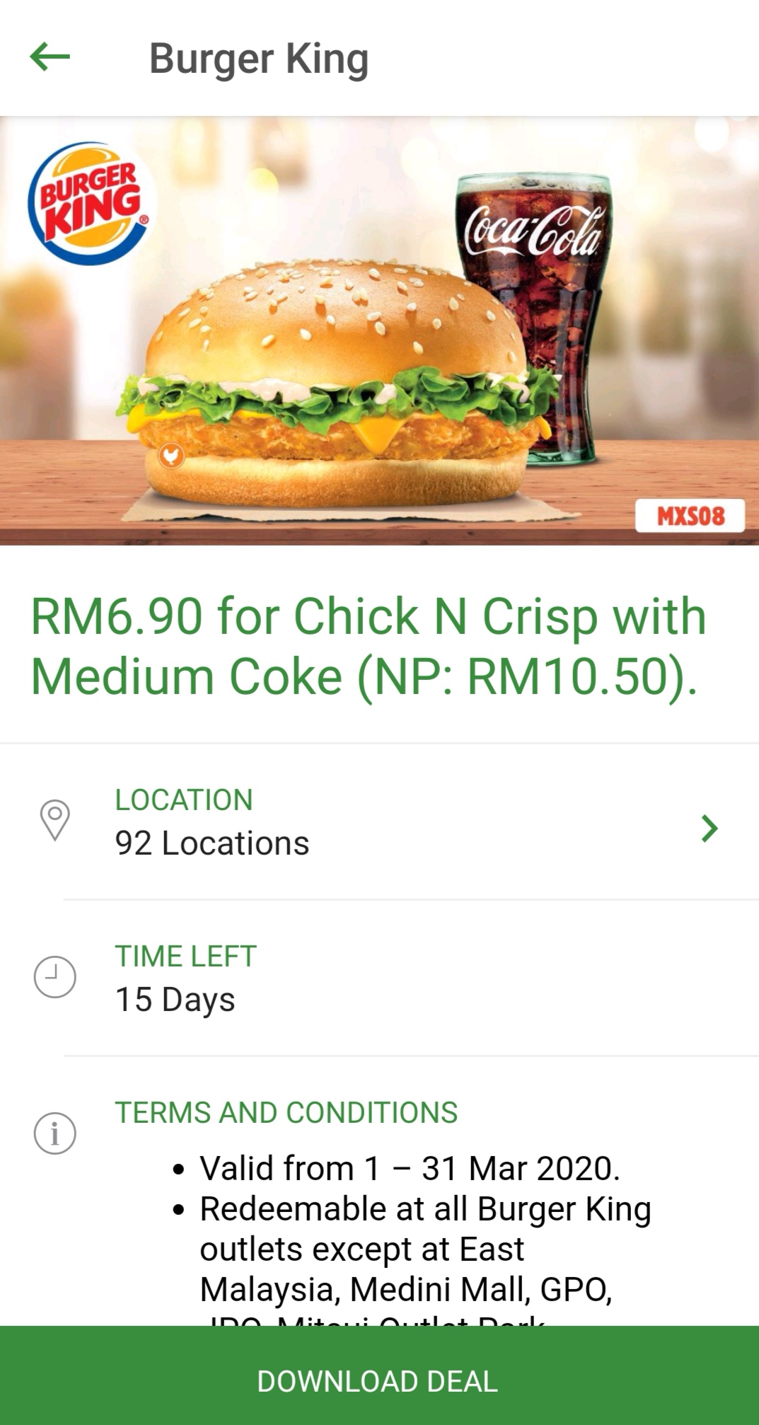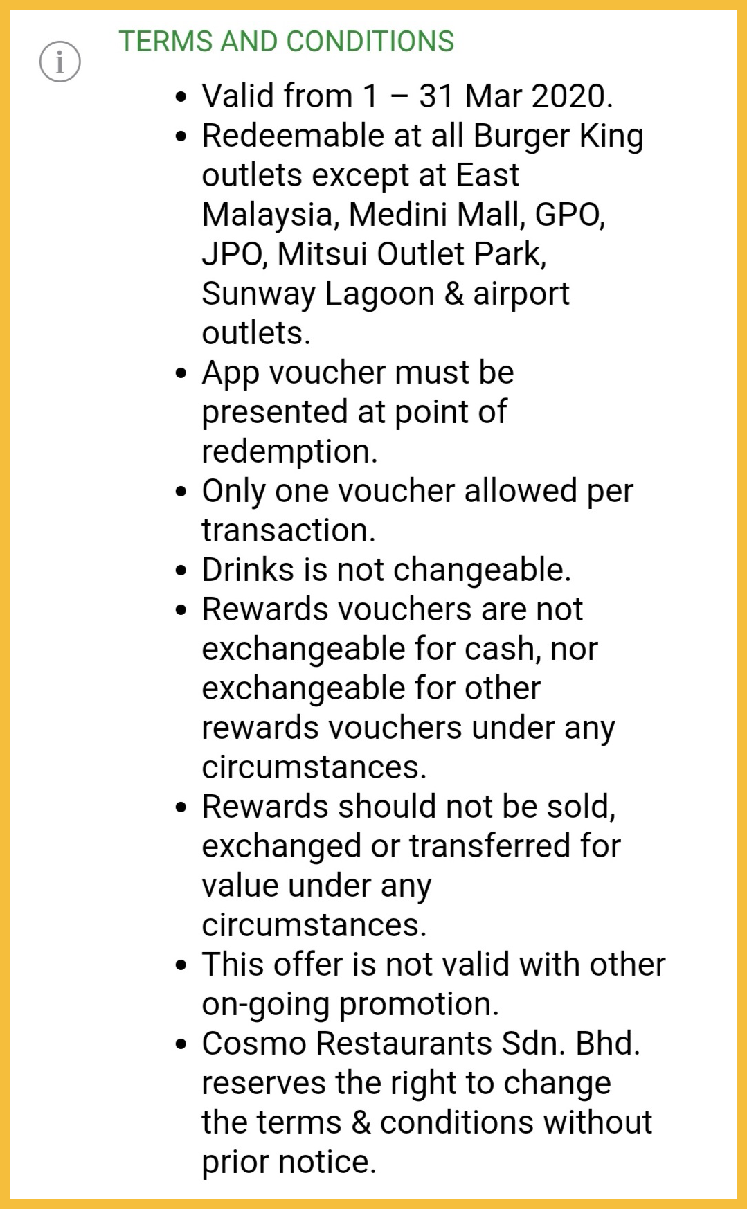 促销地点:大马 Burger King 分行(除了East Malaysia分行,Medini Mall,GPO ,JPO,Mitsui Outlet Park,Sunway Lagoon 及机场分行)