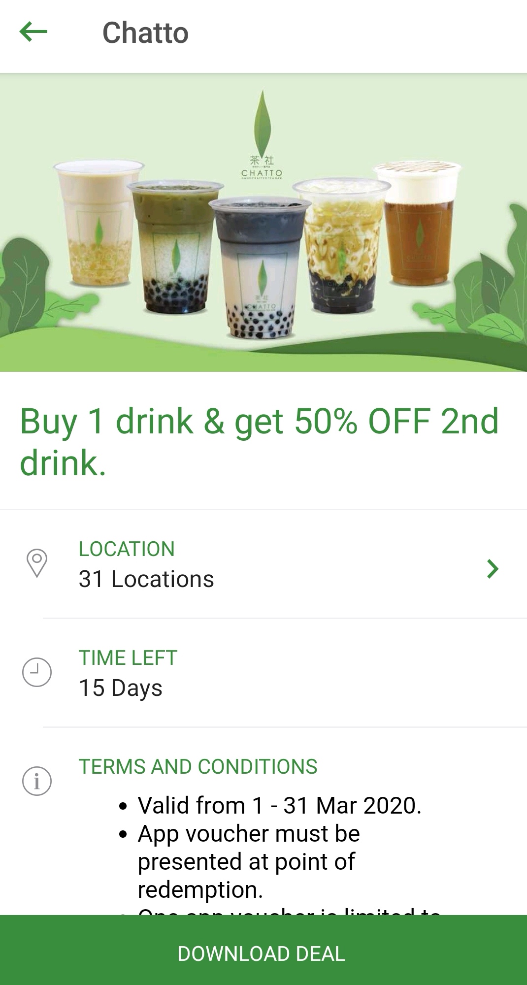 促销活动:Chatto —— 第二杯饮料折扣于50%