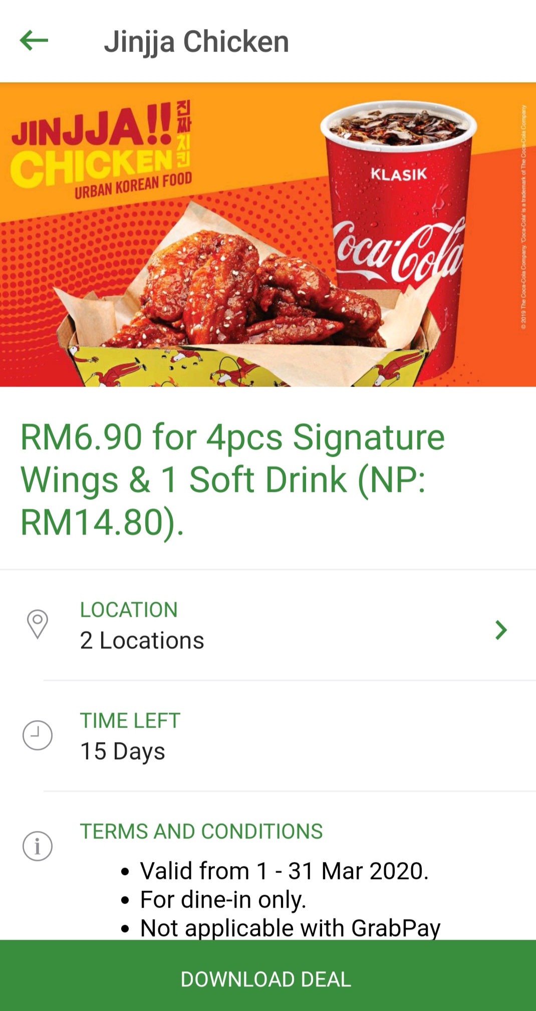 促销活动:Jinjja Chicken —— 4pcs Signature Wing 和一杯饮料只需RM6.90