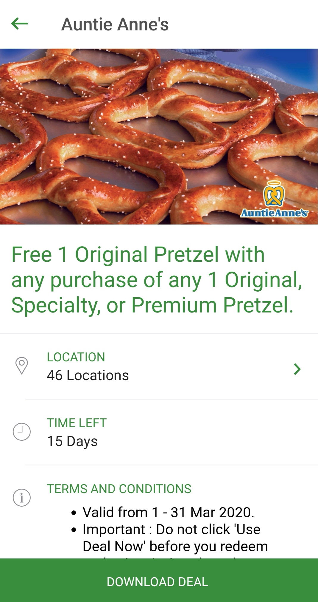 促销活动:Auntie Anne’s —— 购买一份Premium Pretzel,免费送一份Original Pretzel