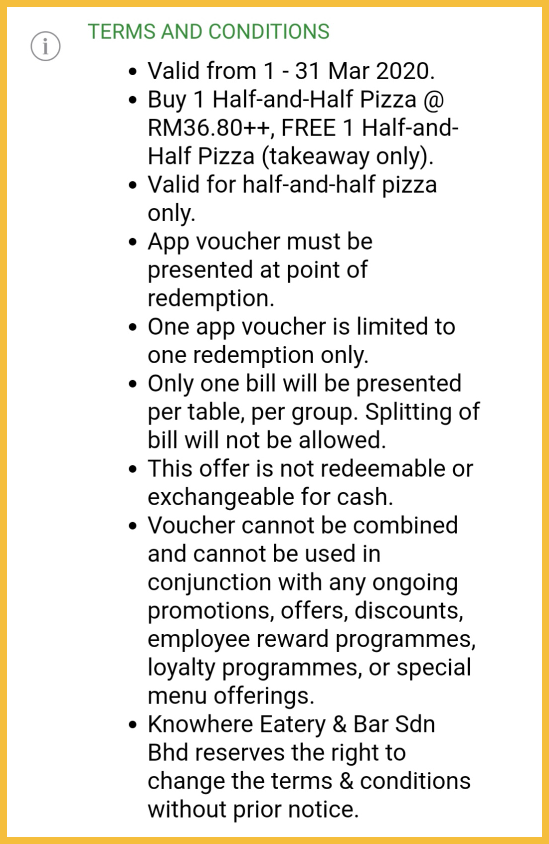 促销活动:Knowhere Bangsar —— 购买一份Half and Half 披萨,免费送一份Half and Half 披萨只需RM36.80
