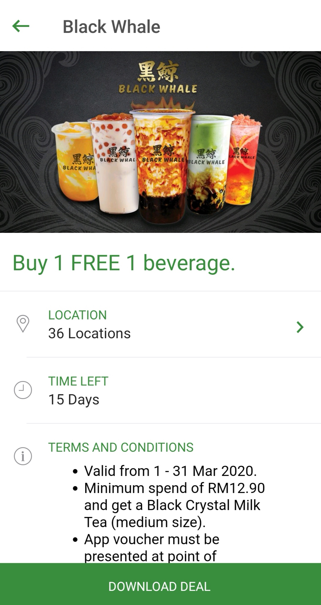 - 必须消费满RM12.90,可免费获得一杯价值 RM12.90 的 Black Crystal Milk Tea(M)