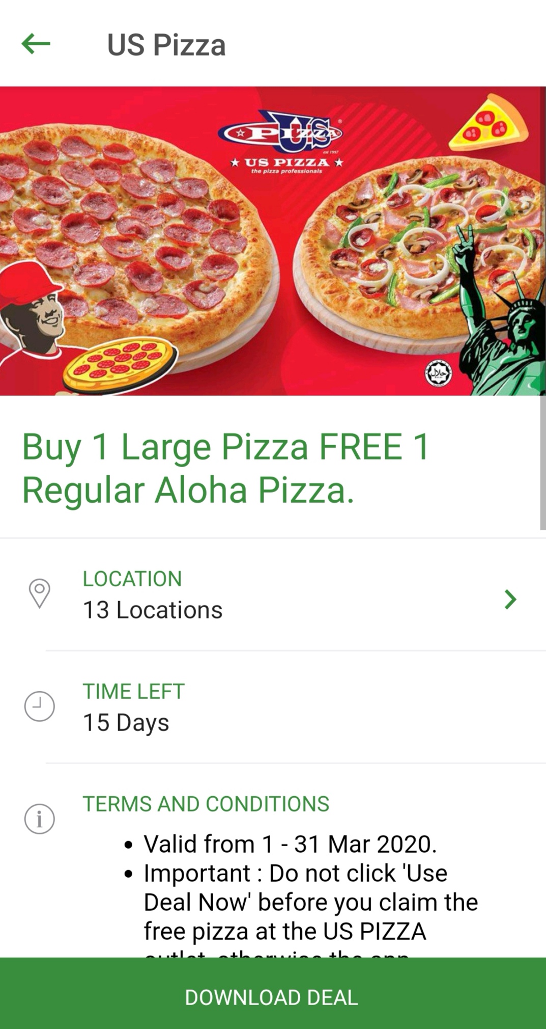 促销活动:US Pizza —— 买一份大Pizza ,免费送一份 Regular Aloha Pizza