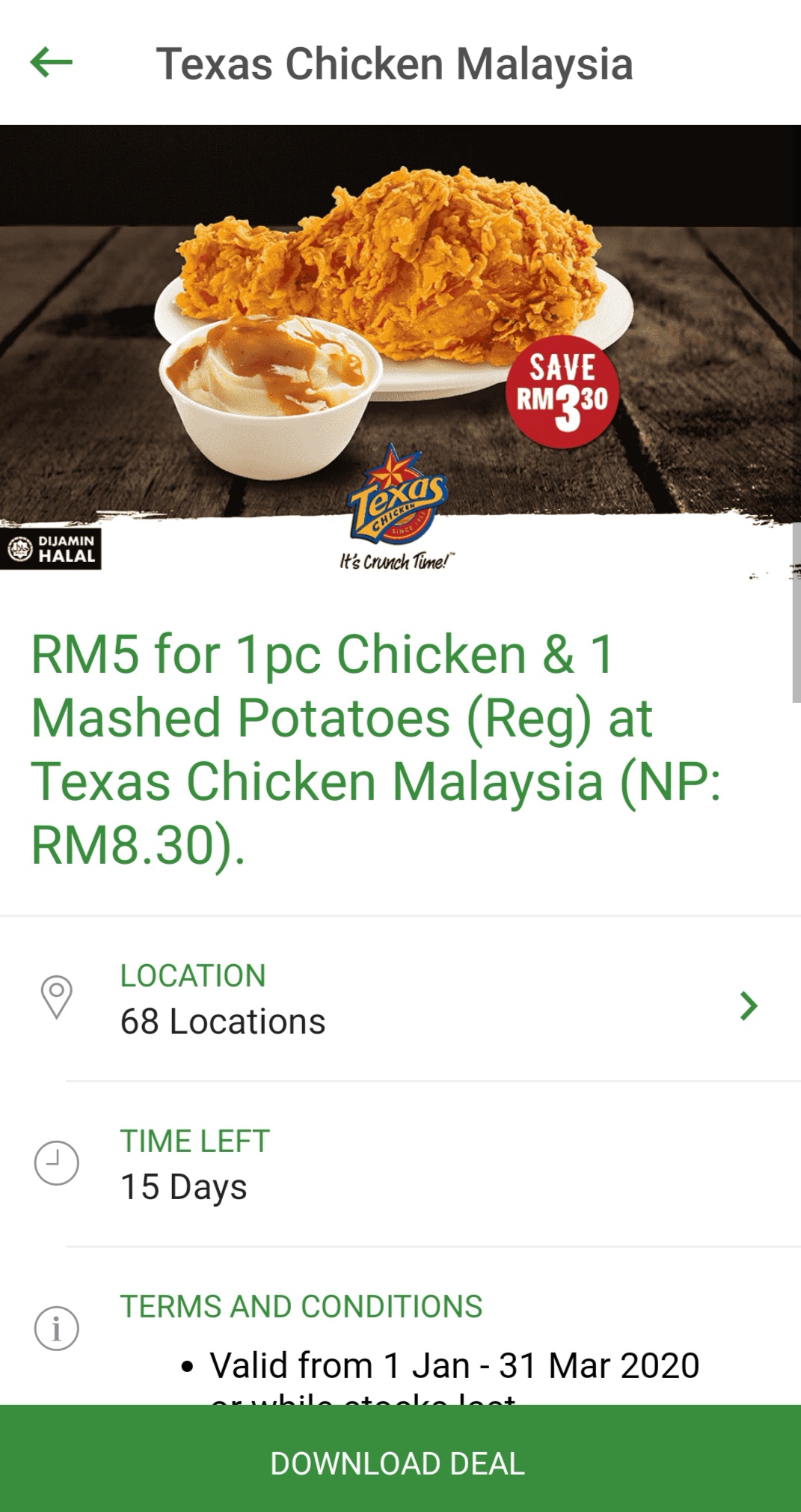 促销活动:Texas Chicken —— 1块炸鸡和一份马铃薯泥只需RM5
