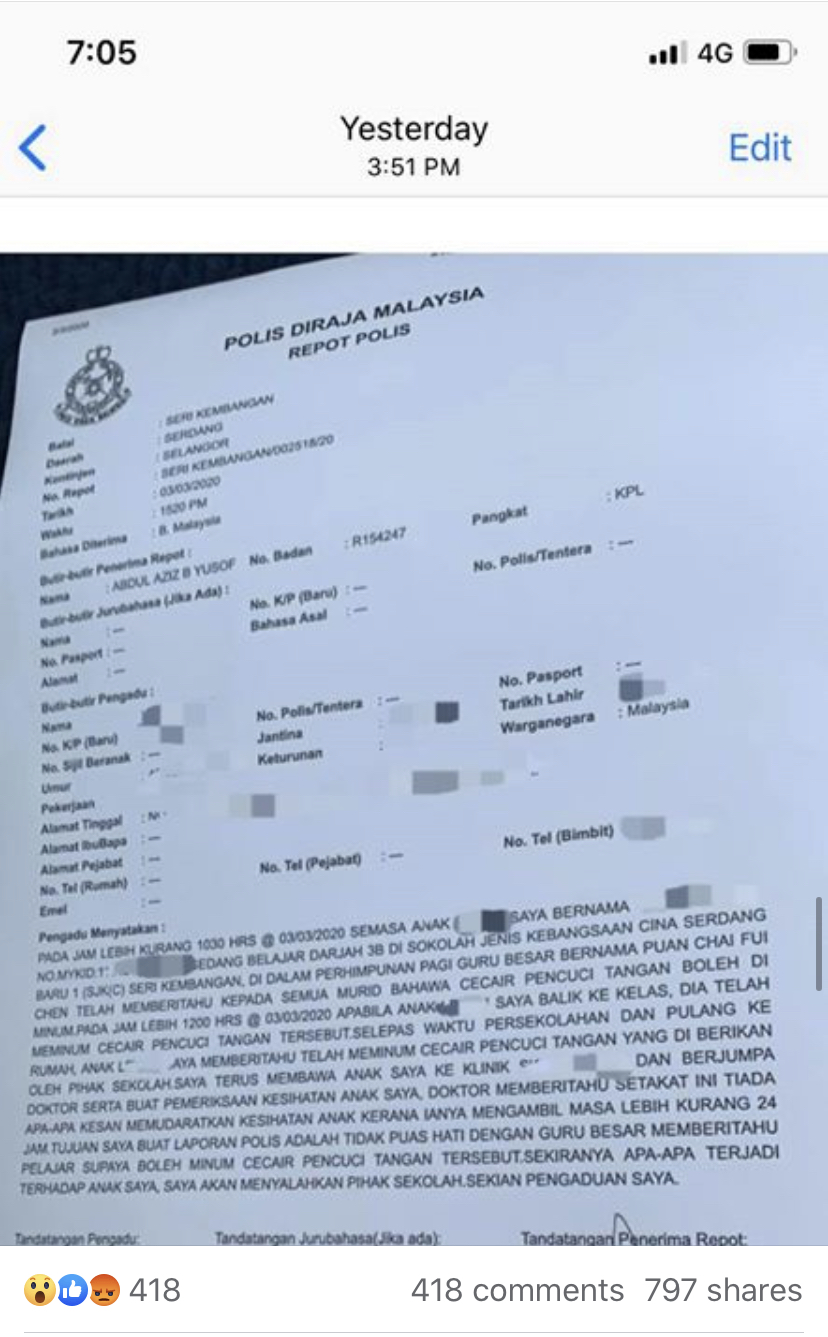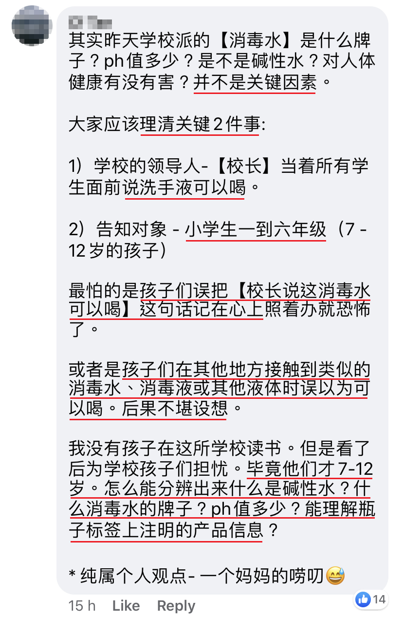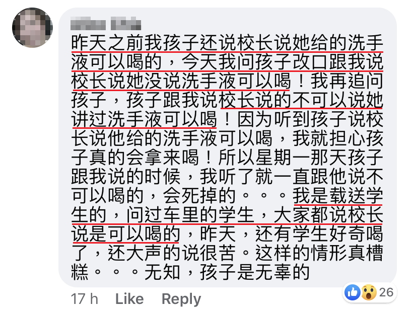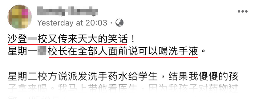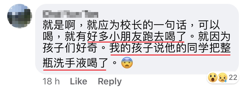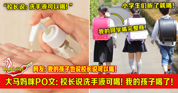 然而,近日一名来自雪兰莪的妈咪在面子书发文,疑似因为校长口误,导致许多小学生把洗手液喝下吐!