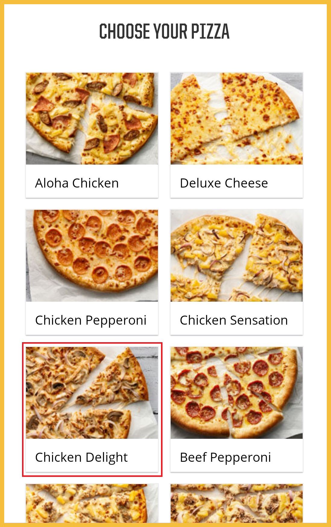 步骤 6:选择你想要吃的披萨口味,如:Chicken Delight。