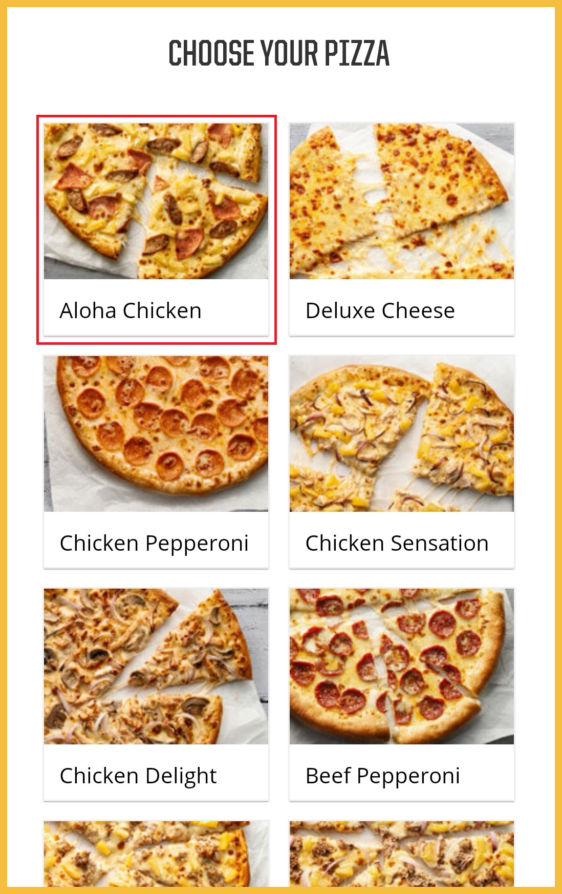 步骤 3:选择你想要吃的披萨口味,如:Aloha Chicken。
