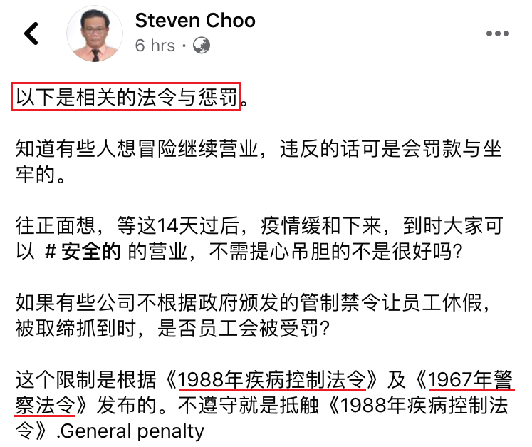 更有者想冒险继续营业,但网民Steven Choo 就在其脸书分享这个做法是违反管制令而遭到罚款与坐牢。