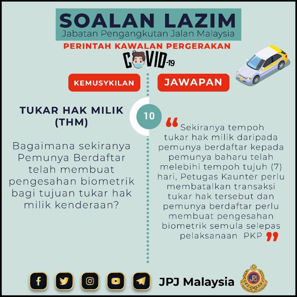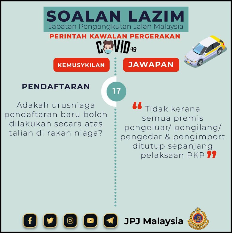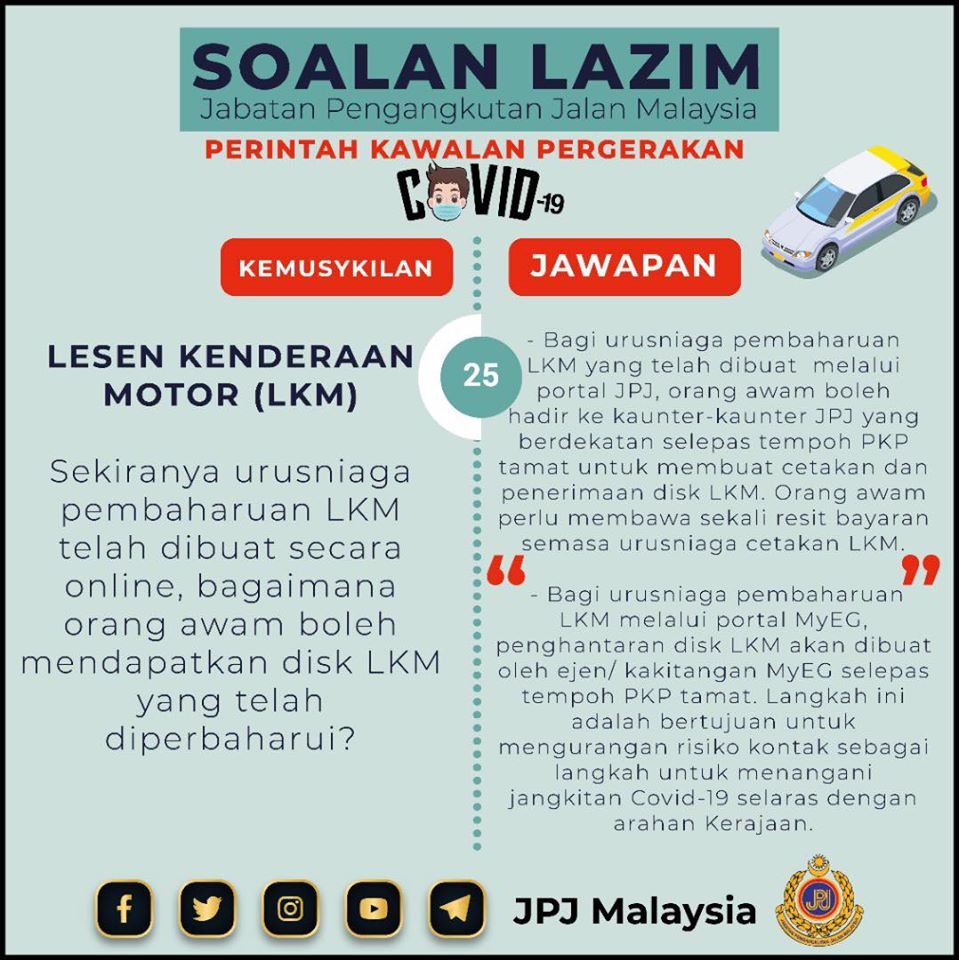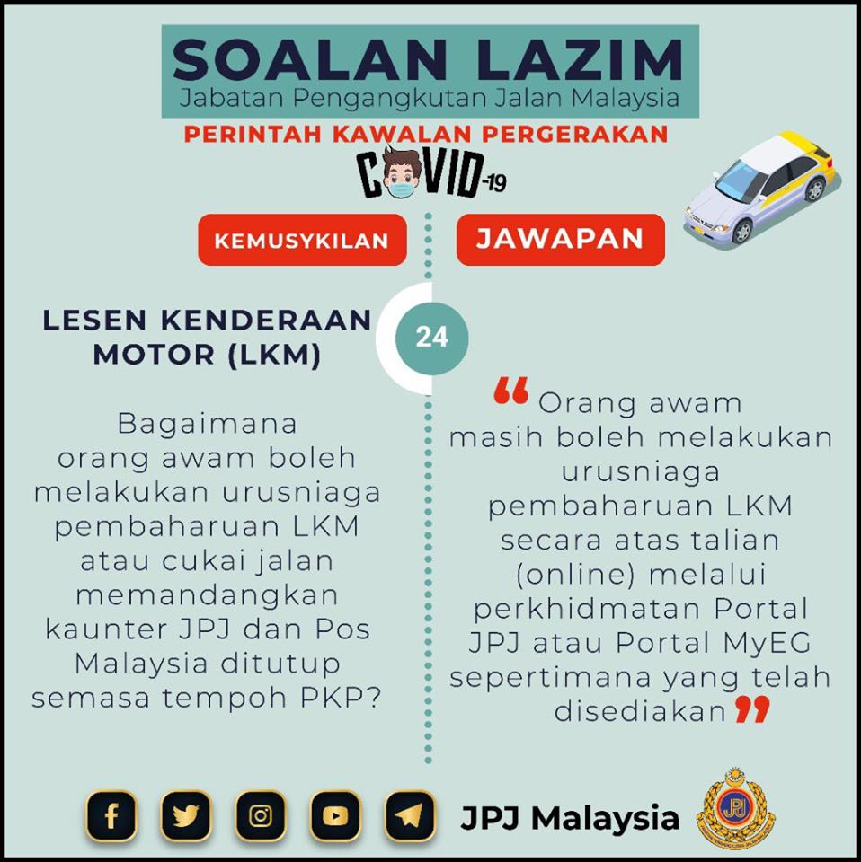5. 陆路交通局柜台(JPJ)和邮政局(Pos)已关闭,行动管制令期间民众如何更新摩托车执照和路税?