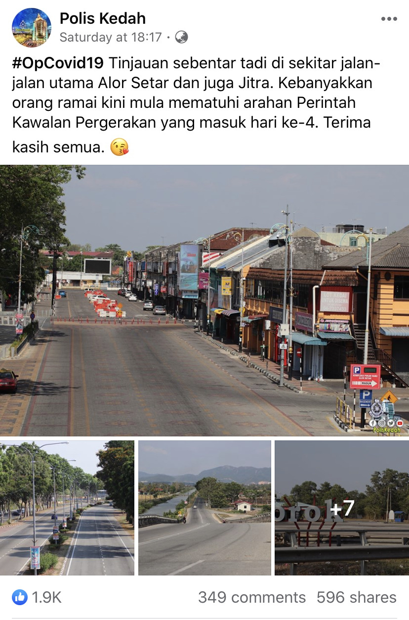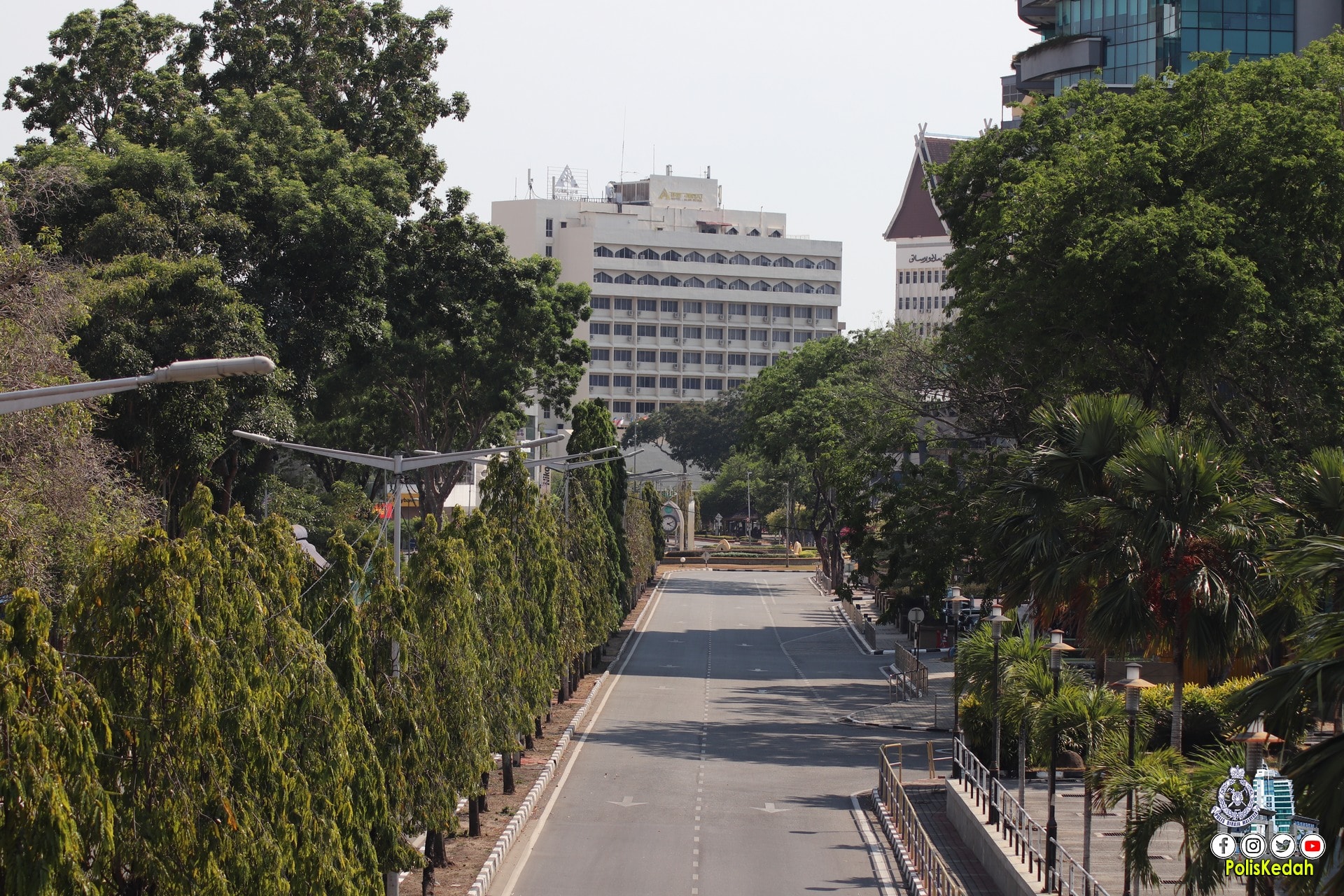 来自吉打州警方的面子书专页,几天前发文分享几张照片。照片里可以看到,Alor Setar 和 Jitra 的一些主要路段都空空如也,几乎完成没有车辆在路上行驶,因此警方在帖文里感谢吉打民众的高度配合。