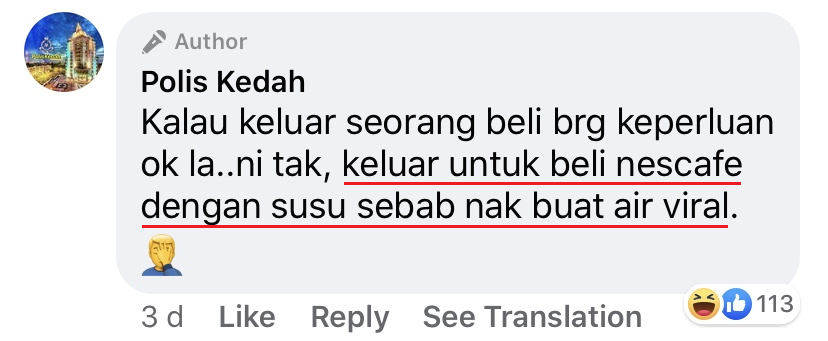 然而该帖文最大的亮点并不是照片也不是警方的赞赏,而是下方的一个留言!警方在留言处写道:「如果是一个人出去购买必需品,那OK!但这个人不是,他出门只是为了购买 Nescafe 和牛奶,以调制现在最流行的饮料!」最后还放了一个「Alamak」的表情以表示无言。