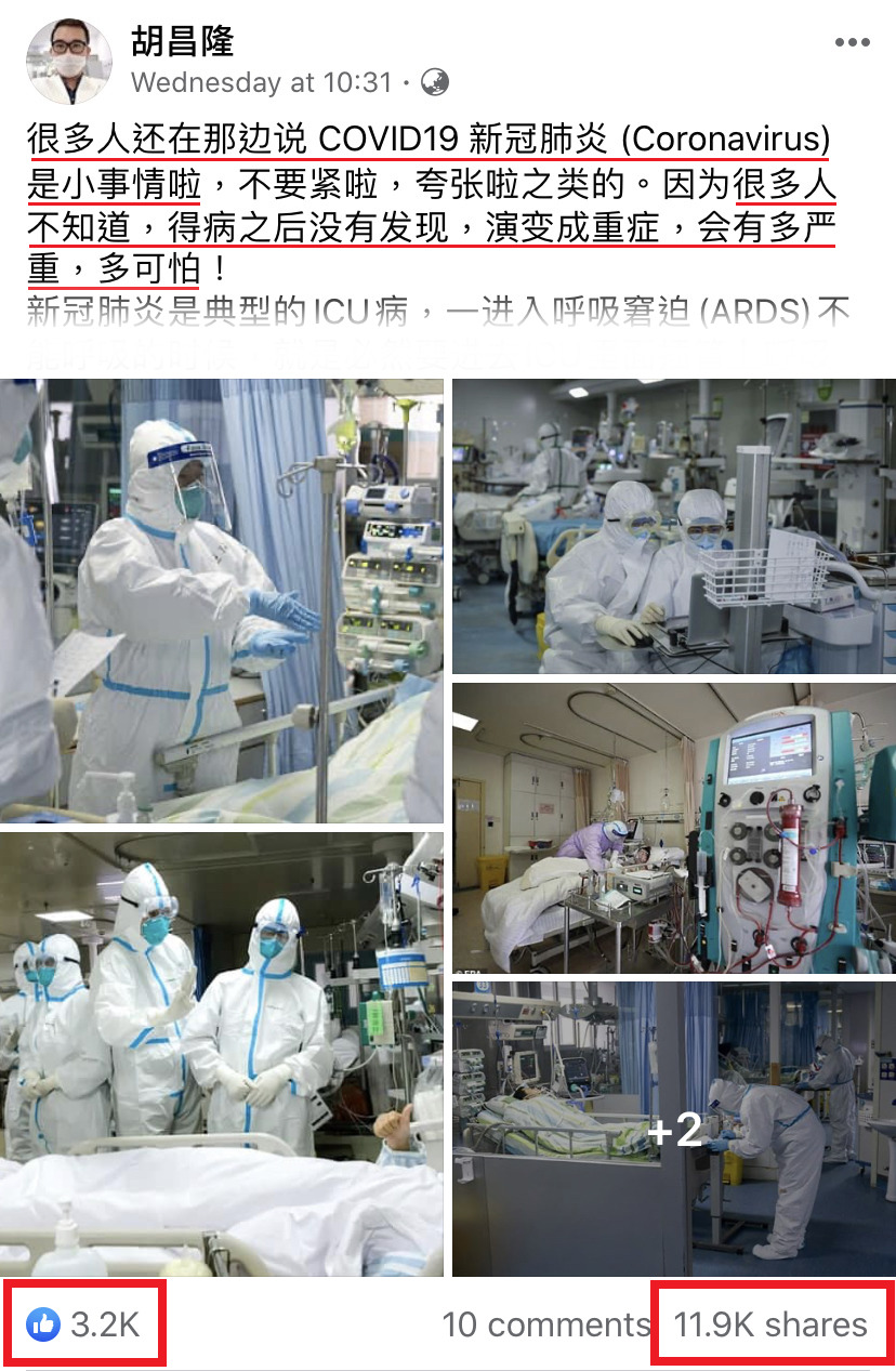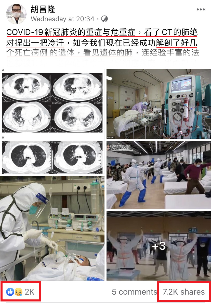 该帖文在短短的2天内就超过1万人转发,随后胡昌隆再发一篇文,提及新冠肺炎的死亡病例,在临离世前所出现的可怕症状!让网友们震惊不已!
