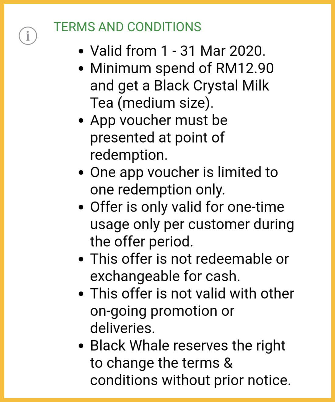 - 必须消费满RM12.90,可免费获得一杯价值 RM12.90 的 Black Crystal Milk Tea(M)
