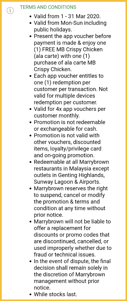 促销地点:大马 Marrybrown 分行(除了Genting Highland,Sunway Lagoon 及机场分行)