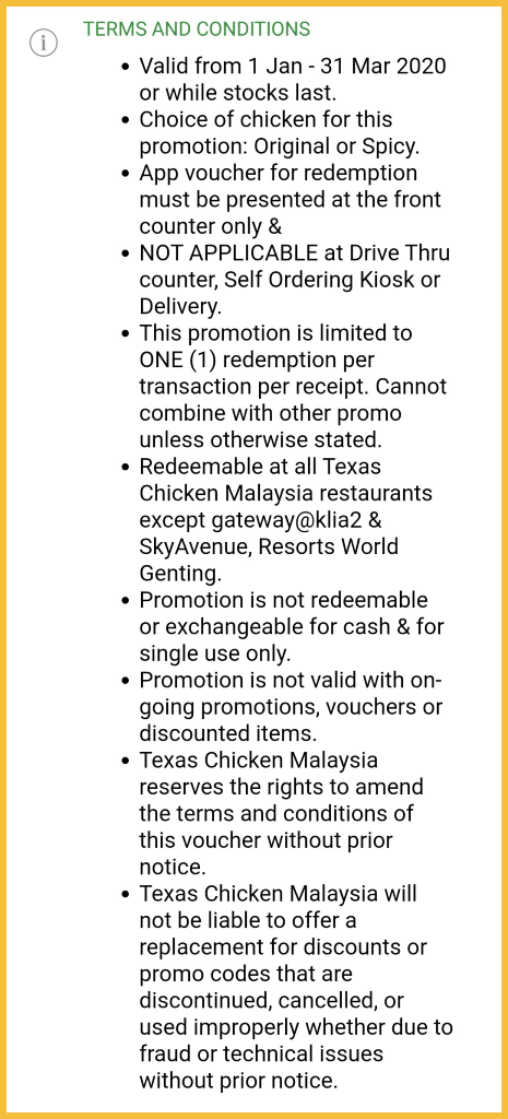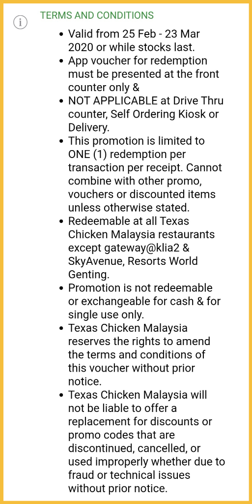 促销地点:大马 Texas Chicken 分行(除了gateway@klia 2,Sky Avenue,Resort World Genting)
