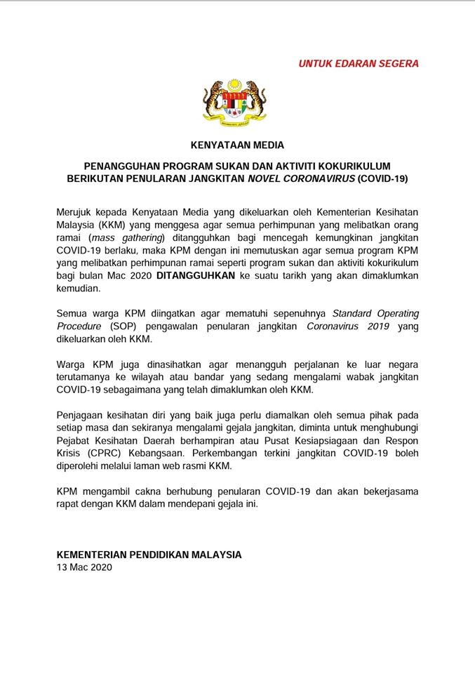 为了防止新冠型肺炎的传播,大马教育部宣布延迟所有3月份内涉及多人的活动,如:体育项目及课外活动,直到另行通知。
