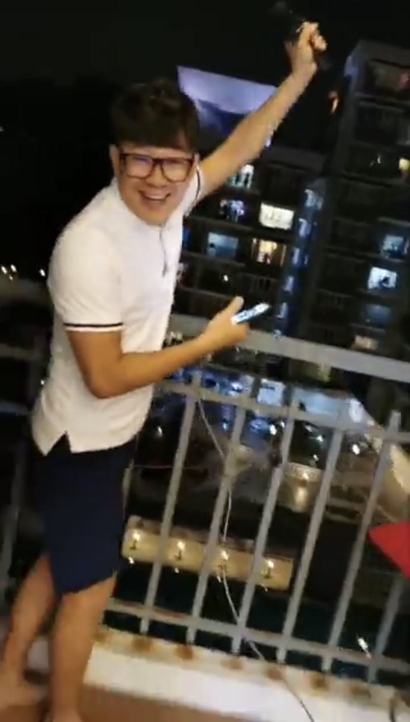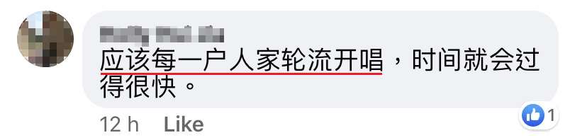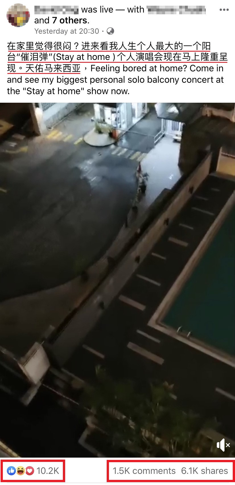 来自吉隆坡的 David 在直播帖文里写道:「在家里觉得很闷?进来看我人生个人最大的一个阳台“催泪弹”(Stay at home )个人演唱会现在马上隆重呈现。天佑马来西亚!」