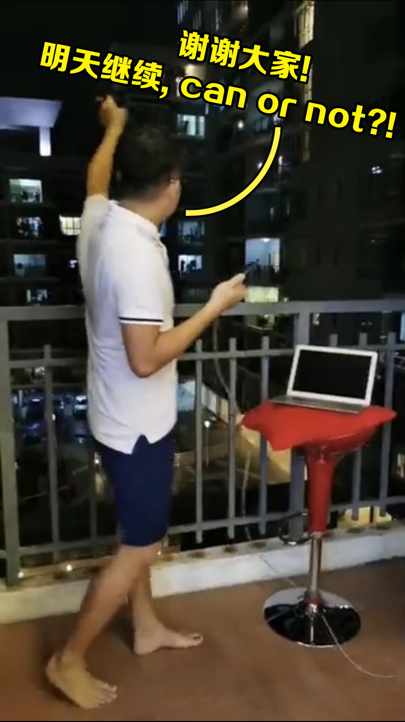 ▼ 「阳台演唱会」进行了约20分钟以后,David就和邻居解释道:「我答应了这栋楼的管理层说只开20分钟的演唱会,所以今天就到这里为止。明天再继续,Can or not(可不可以)?!」