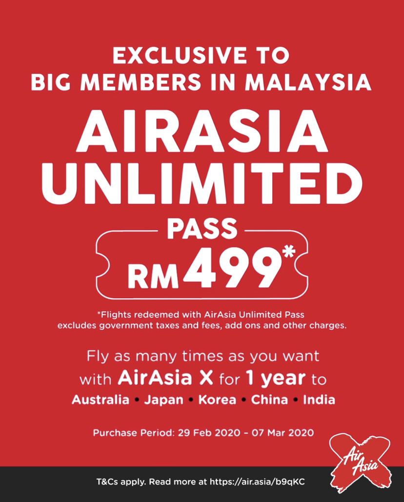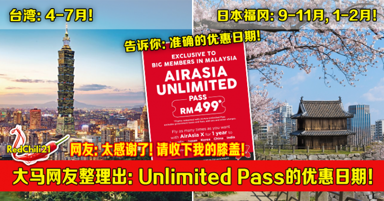 近日大马廉价航空公司——亚航(AirAsia)推出了无限次飞行证(Unlimited Pass),只需付RM499购买该飞行证,就可以无数次免费飞往各个国家,长达1年哦!