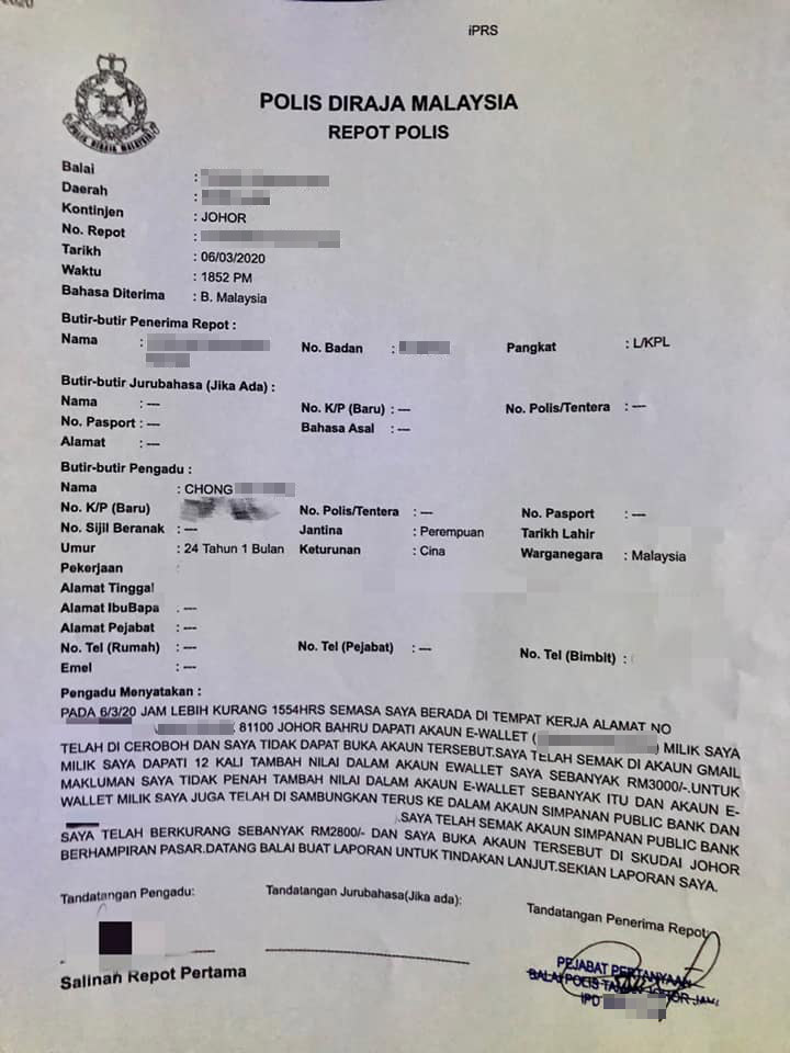 现在那RM3000是处于hold着的状态,我也打去银行cancel卡了,也报了警,TNG那边我也通知了。而我的 TNG eWallet ID也被hack走了,我用我的电话号码登入,完全是空号状态,也就是说里面的号码被换走了。