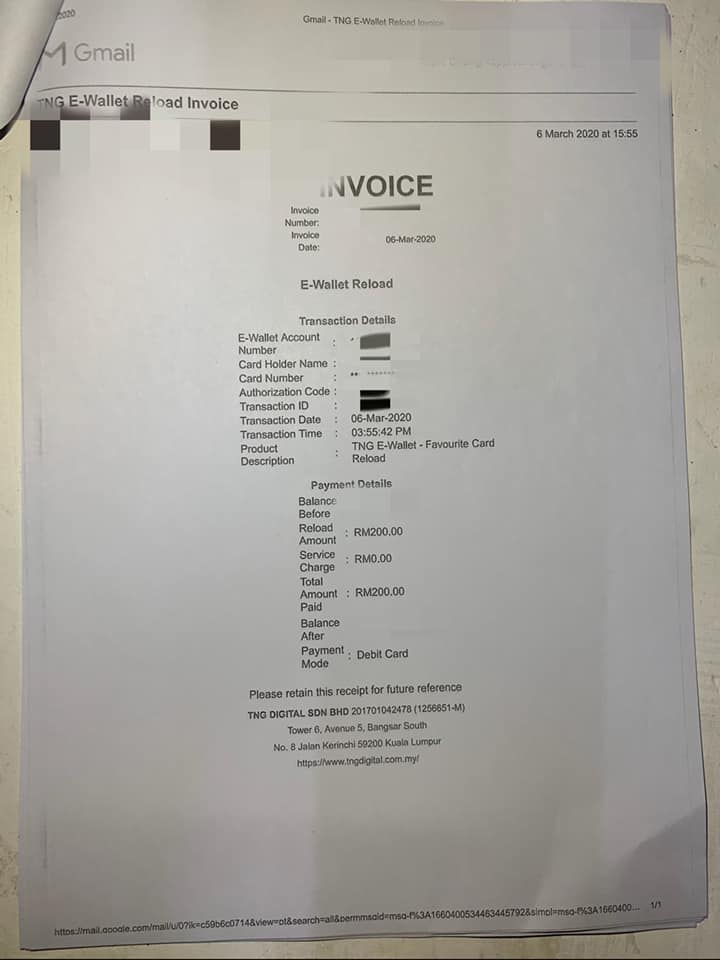 Gmail 里收到的信息都是过账了的invoice,并多达12封这样的信息,里面都是RM200、RM500,这样一点一点转的,都是在一个小时之内被转了RM3000。