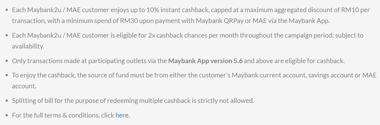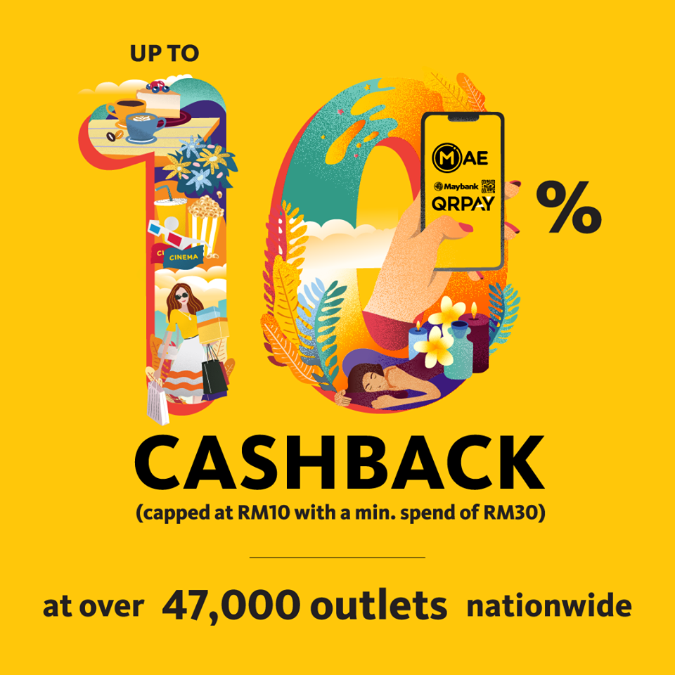 只要你使用 Maybank QRPay 或 MAE 来付款,可享有10%现金回扣!不过,必须消费 RM30 或以上才可享有这优惠哦!而且无限任何时段,都可享有10%现金回扣!