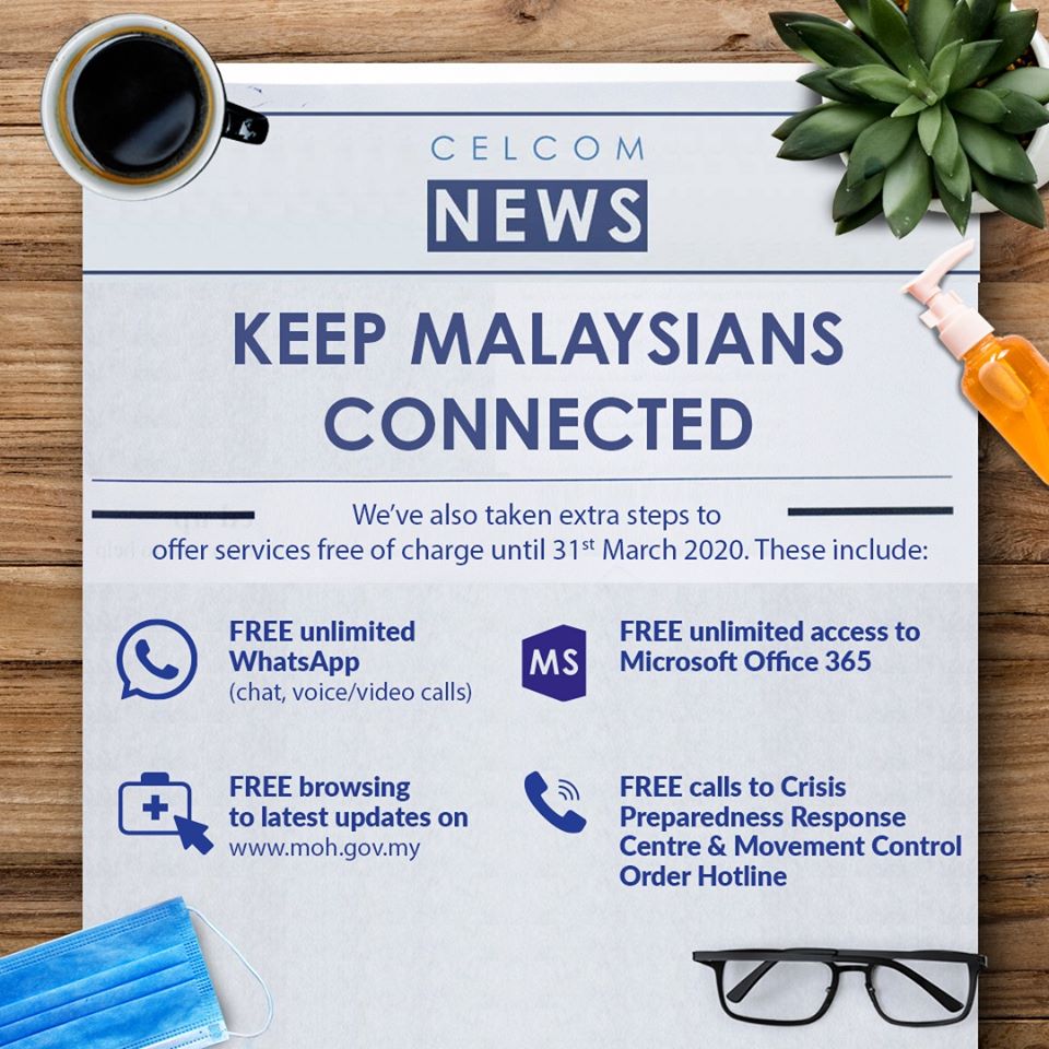 Celcom 用户在使用 WhatsApp 和 Microsoft Office 365时,将不会消耗现有的数据。但有效时间为 8am 至 6pm 。