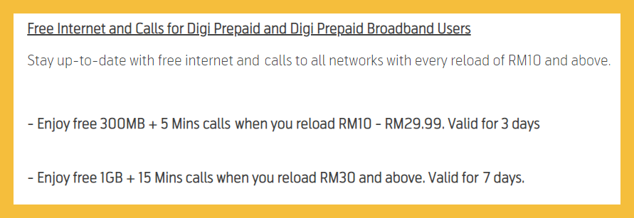 ▼ 此外,Digi Prepaid 用户加额 RM10 至 RM29.99 时,可免费获得 300MB 上网数据和5分钟免费通话。(有效期为3天)