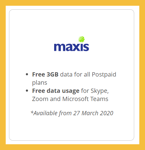 ▼ 此外,所有 Maxis Postpaid 用户将在3月27日起可免费获得3GB的上网数据,以及游览Skype,Zoom 和 Microsoft Teams 时,不会消耗现有的数据。
