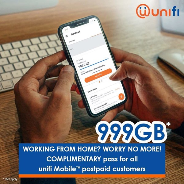 Unifi Mobile Postpaid 用户,可免费获得 999GB LTE Hotspot 上网数据。而这项优惠从即日起直到3月31日!