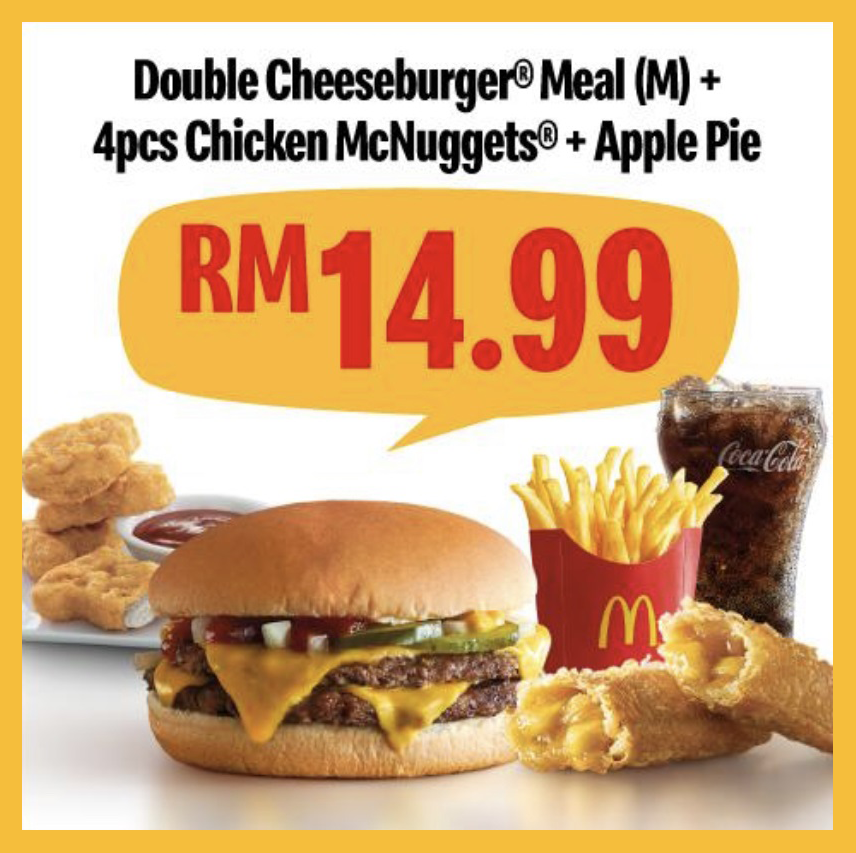▼ Double Cheeseburger Meal(M) + 4pcs Chicken McNuggets + Apple Pie 只需 RM14.99!
