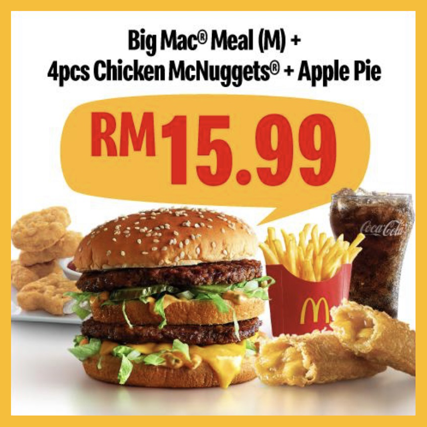 ▼ Big Mac Meal(M) + 4pcs Chicken McNuggets + Apple Pie 只需 RM15.99!