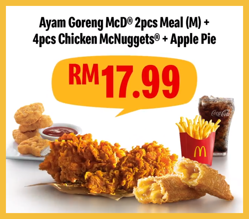 ▼ Ayam Goreng McD 2pcs Meal(M) + 4pcs Chicken McNuggets + Apple Pie 只需 RM17.99!