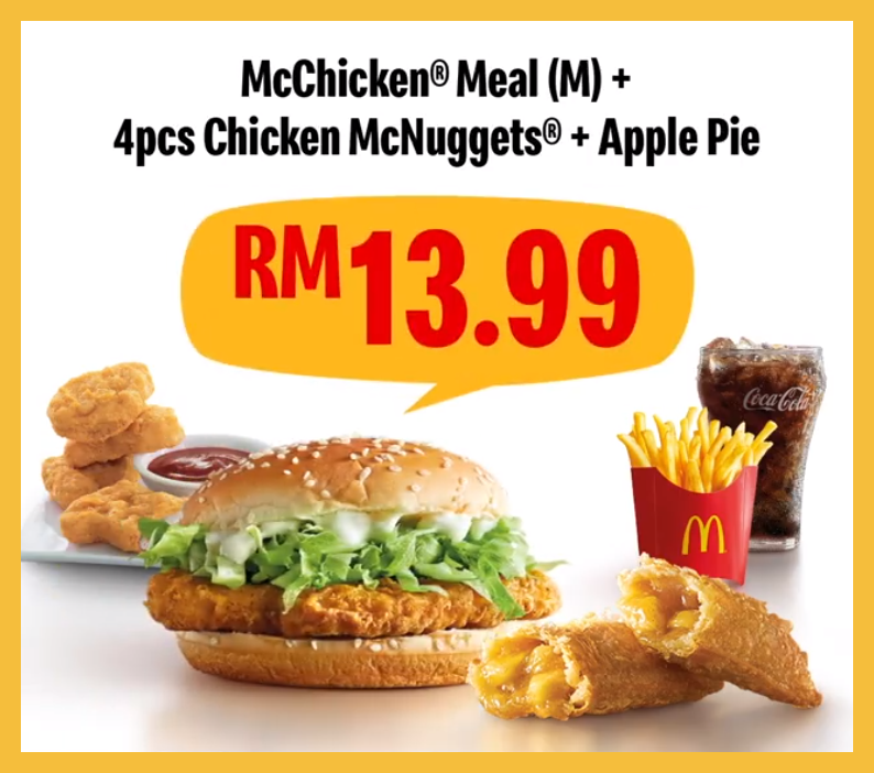 ▼ McChicken Meal(M) + 4pcs Chicken McNuggets + Apple Pie 只需 RM13.99!