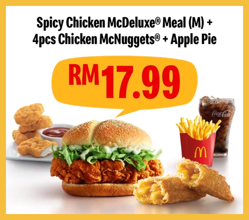 ▼ Spicy Chicken McDeluxe Meal(M) + 4pcs Chicken McNuggets + Apple Pie 只需 RM17.99!